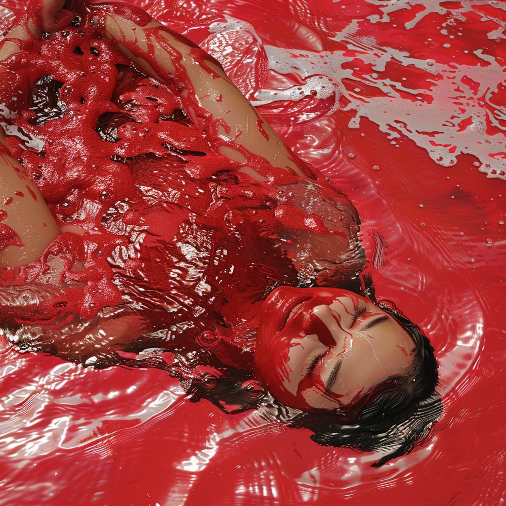 shot from the top, a party costume woman in water with her face covered by melted red ice, in the style of jennifer rubell, experimental filmmaking, louise bourgeois, aerial abstractions, dusan djukaric, blink-and-you-miss-it detail, realistic –ar 16:9 --v 6.0