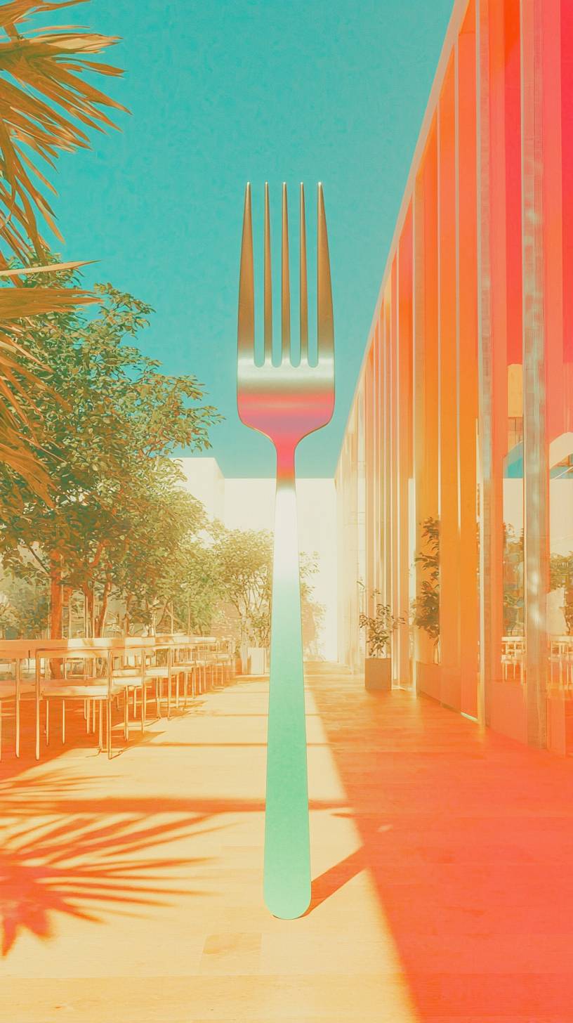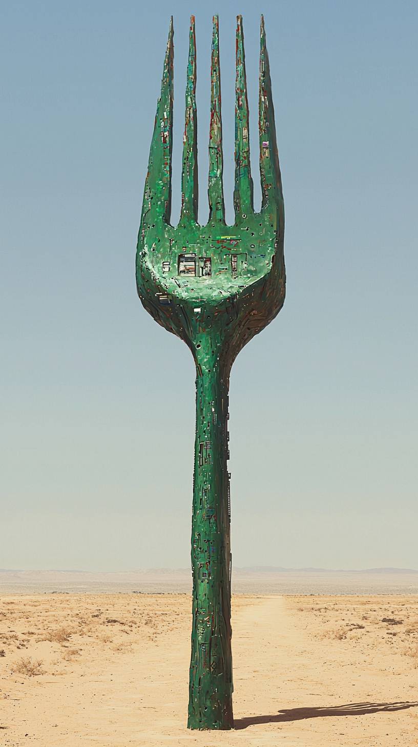 The fork stabbing positioned at the intersection of a wooden boardwalk that branches into multiple paths. middle of the Tesla Texas gigafactory, the fork are stabbing to the ground with the sharp part of the fork at the bottom to the ground, a long road is with part made of electronic part slats leading to an enormous upside down green and blue fork in the street at sunset, hyper-realistic, photorealistic. The composition is symmetrical, with a low-angle shot, resulting in a hyper-realistic photography style --chaos 50 --ar 9:16 --quality 2 --personalize m6levxq --stylize 1000 --v 6.1