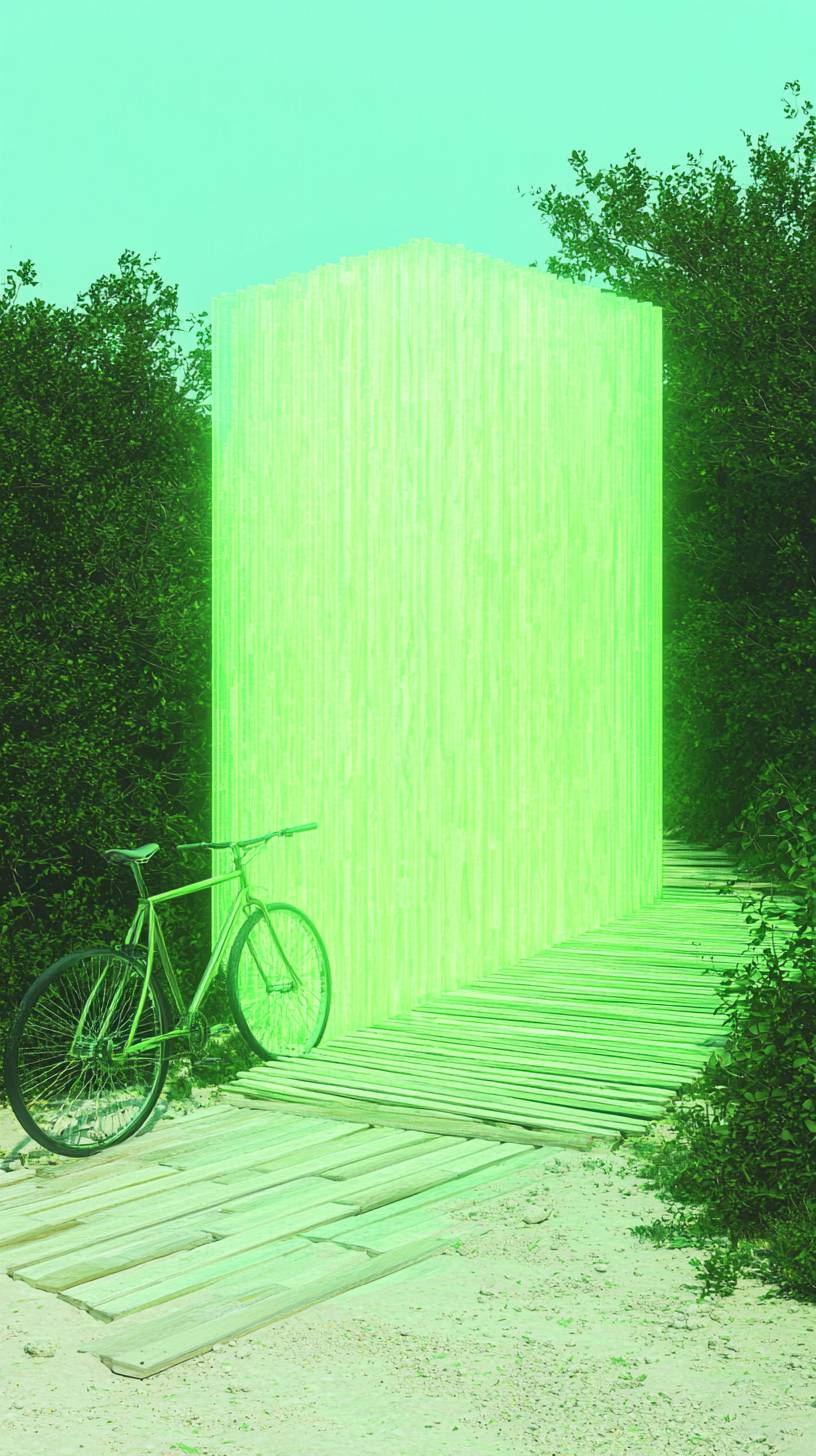 叉子刺入一个木栈道的交叉口,栈道分成多条路径。在特斯拉德克萨斯工厂的中央,叉子的尖端指向地面。一条长路部分由电子元件和木板构成,通向街道上一个巨大的倒置绿蓝色叉子,黄昏时分,具备超现实的摄影风格。构图对称,采用低角度拍摄,呈现出超真实感的摄影风格。