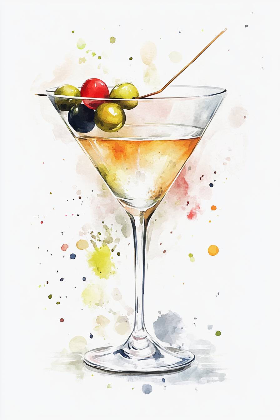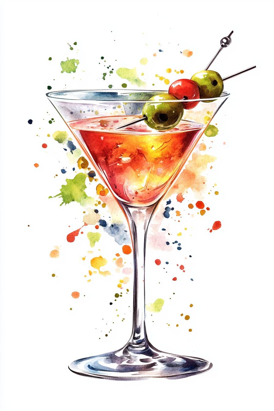 帮助我制作一张手绘水彩风格的马提尼鸡尾酒海报,外观:盛在经典的马提尼杯中,液体清澈明亮,杯子装饰着一串橄榄,看起来精致高档。手绘水彩效果明显,必须是手绘水彩效果,必须是手绘水彩效果,细节清晰,色彩饱和度高,背景为白色。