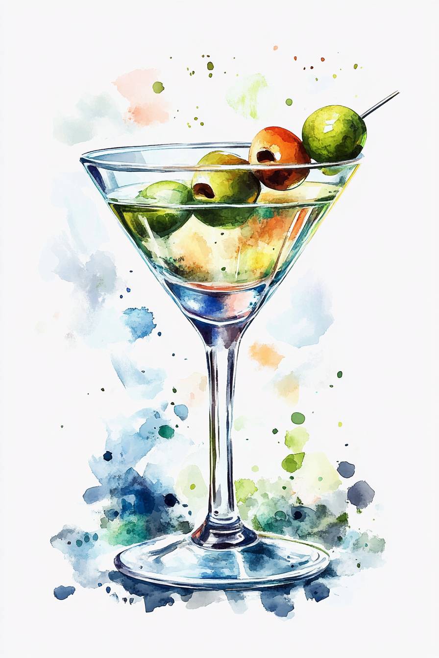 Help me make a hand-painted watercolor style Martini cocktail poster, appearance: served in a classic Martini glass, the liquid is clear and bright, the liquid is clear and bright, and the cup is decorated with a string of olives, which looks exquisite and advanced. Hand-painted watercolor effect is obvious, must be hand-painted watercolor effect, must be hand-painted watercolor effect, clear details, high color saturation, the background is white, --ar 2:3 --v 6.1