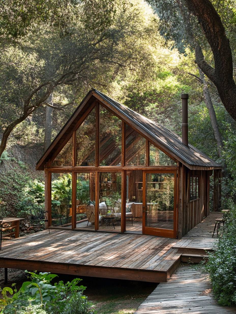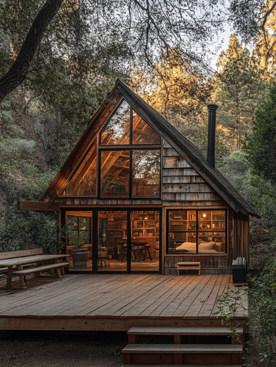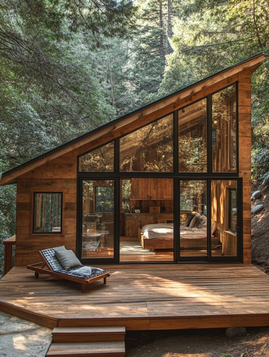 A small wooden cabin with large windows and an angled roof, located in the forest of sunny California, with a wooden deck around it. --ar 3:4 --v 6.1