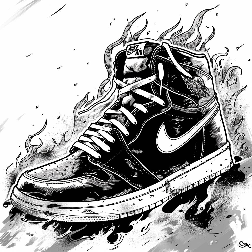 图文小说风格的黑白艺术,中间是复古乔丹鞋,鞋带在燃烧,背景为白色。