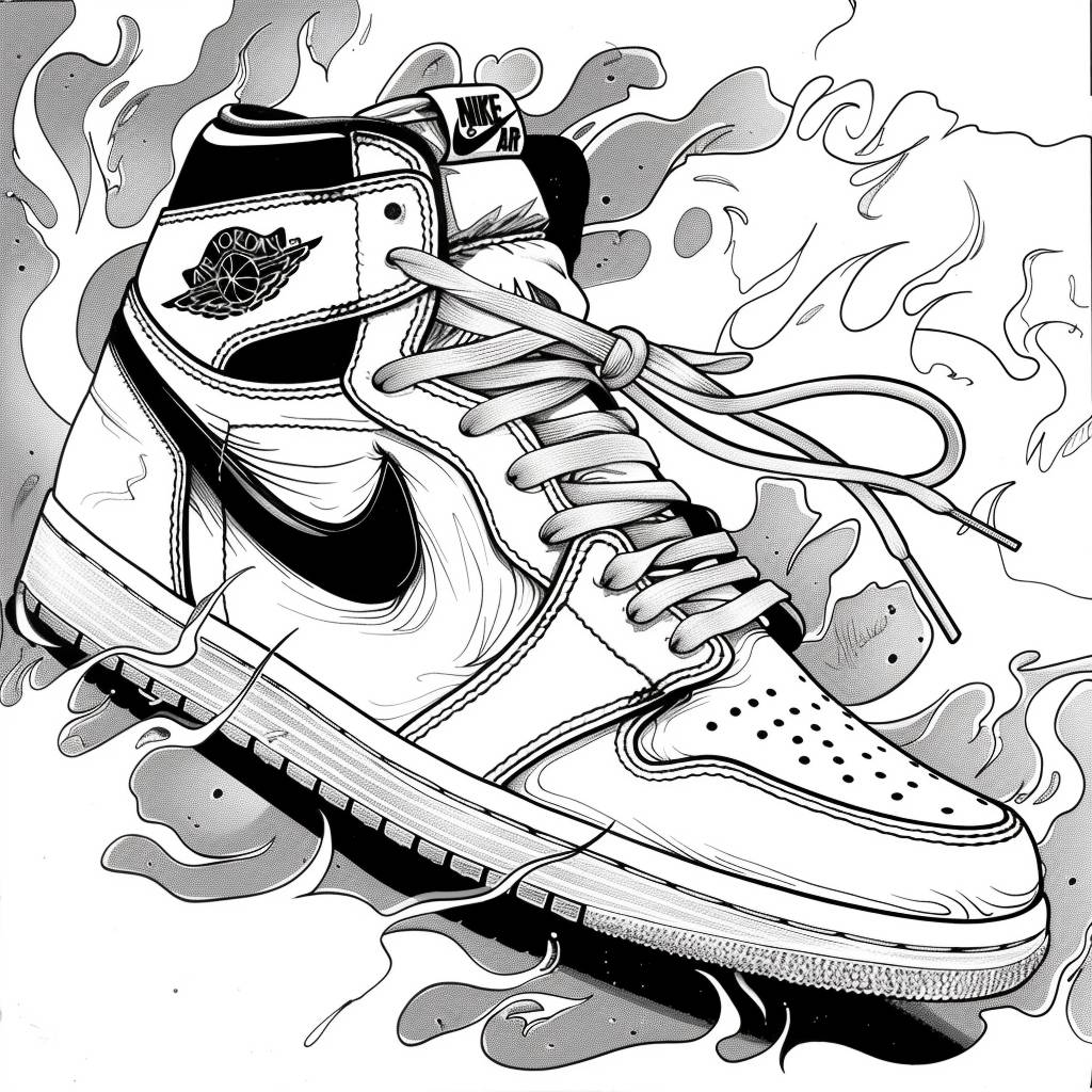 Graphic novel style art black and white color retro Jordan shoe in tge middle of the page with the shoe strings fire with a white background --v 6.0