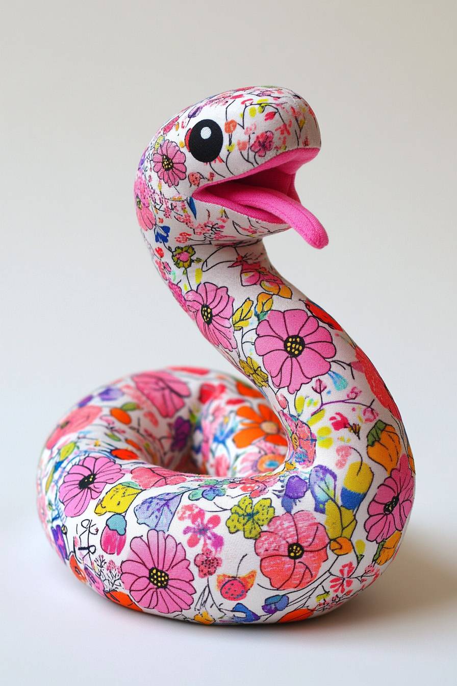 A cute, happy cute snaker with pink flowers and colorful patterns, show its Pink short tongue,fluffy,a plush toy on a white background, in the style of Jellycat. --ar 2:3 --v 6.1