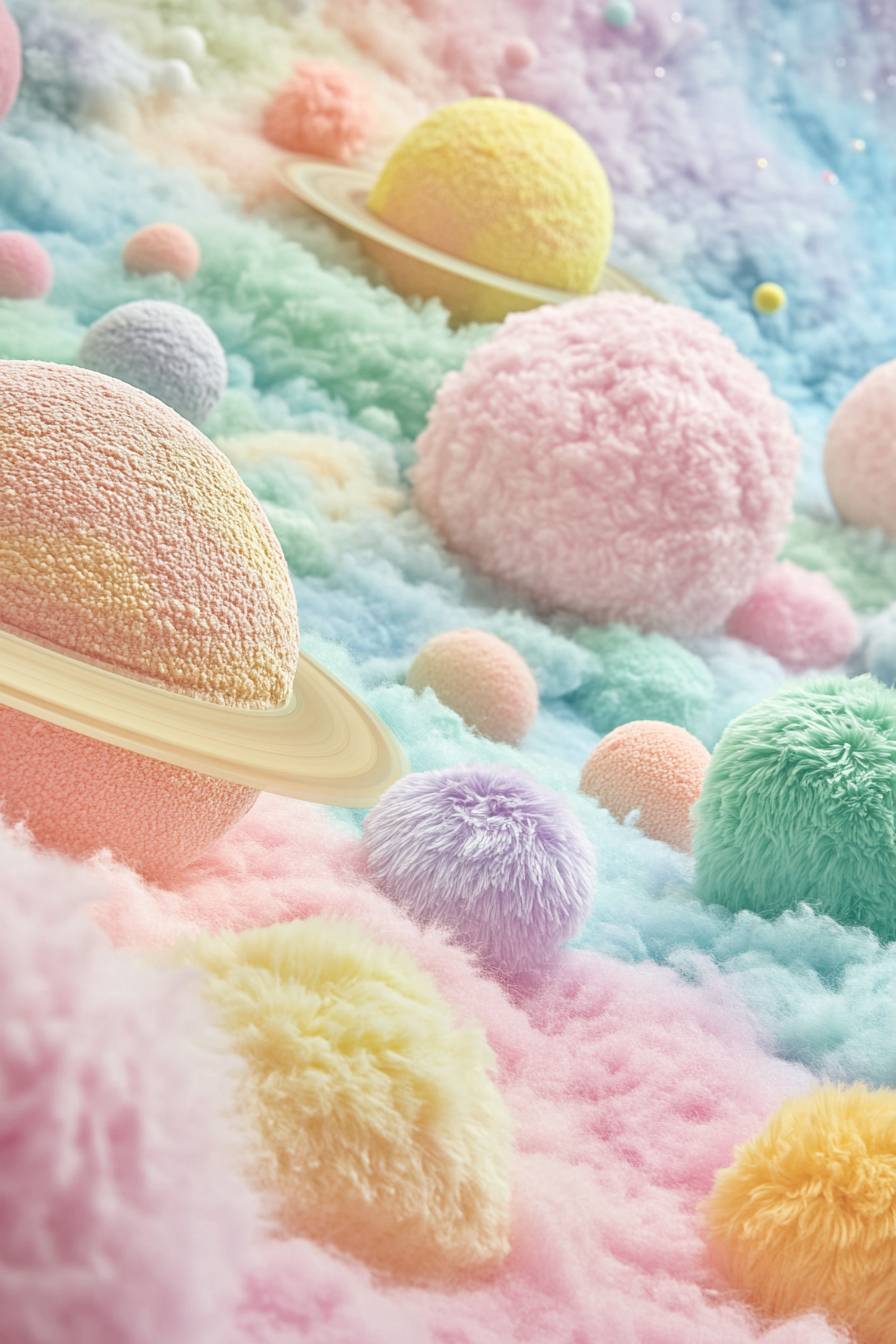 图片中的毛绒宇宙展现出美丽的色彩对比,带来了丰富的视觉层次。背景由清新的薄荷绿、柔和的薰衣草蓝和浅粉色毛绒质感构成,营造出宁静而深邃的宇宙感。行星们染上了温暖的色调,散发出柔和的柠檬黄、桃橙色、温柔的珊瑚粉和奶茶色,每一个都像一颗温暖的毛绒糖果漂浮在太空中。土星的环变成了柔和的珊瑚粉丝带,轻柔缠绕,形成温暖的光环效果。温暖的小毛球星星点缀在冷色调的背景上,使整个宇宙充满了甜美而柔软的对比,仿佛置身于温暖而梦幻的毛绒星海中。