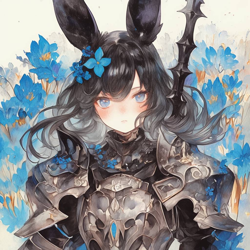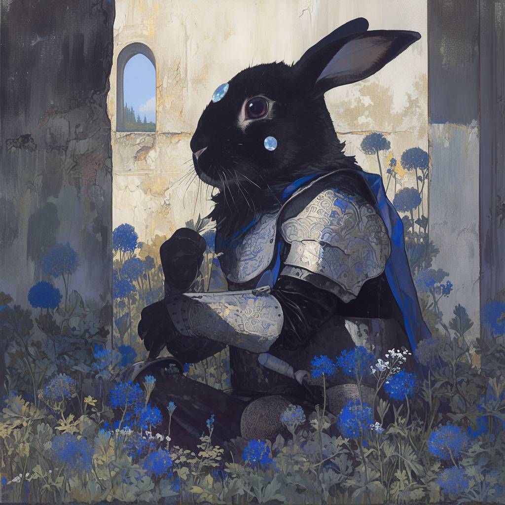 crayon arts, black toddler rabbit carbuncle in silver luster silver decorated black armor with silver decorated sapphire embedded in forehead, sapphire embedded in forehead, blue flowers, backgroud dark historic ruins ruins --niji 6