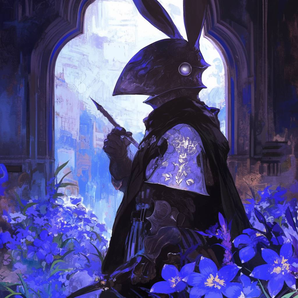 黑色幼兔穿着银饰的黑色盔甲,额头镶嵌蓝宝石,背景是黑暗的历史遗迹。