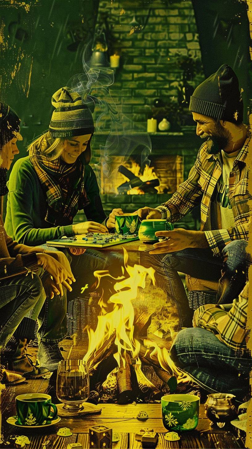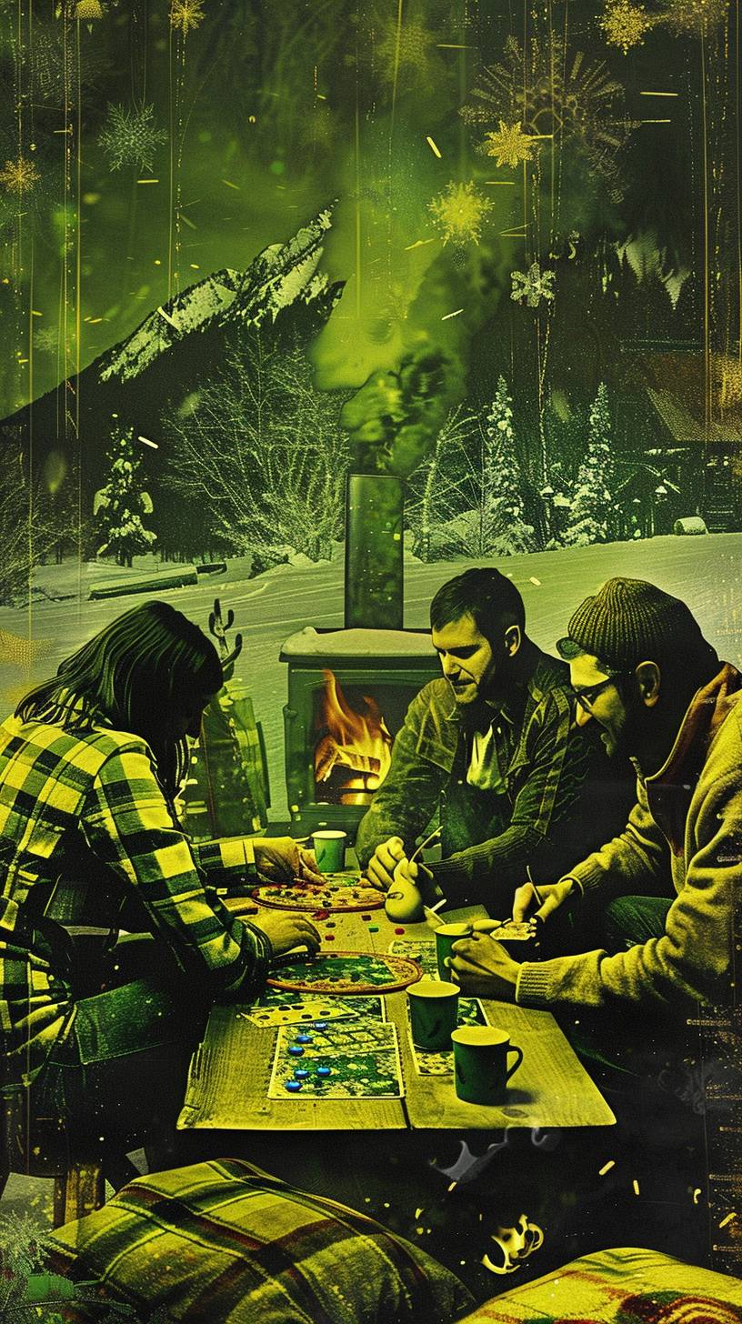 一群朋友在温暖的冬 evening 玩桌游,围坐在壁炉旁,手握热巧克力,披着毯子,像一张怀旧的照片。