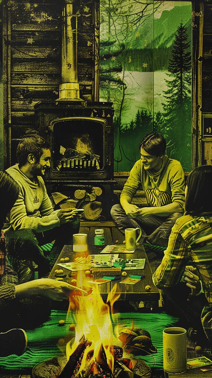 A group of friends playing a board game on a cozy winter evening. They are gathered around a fireplace, with mugs of hot chocolate and blankets. In the style of a nostalgic photograph. --sref 1202952669 --ar 9:16 --v 6.0