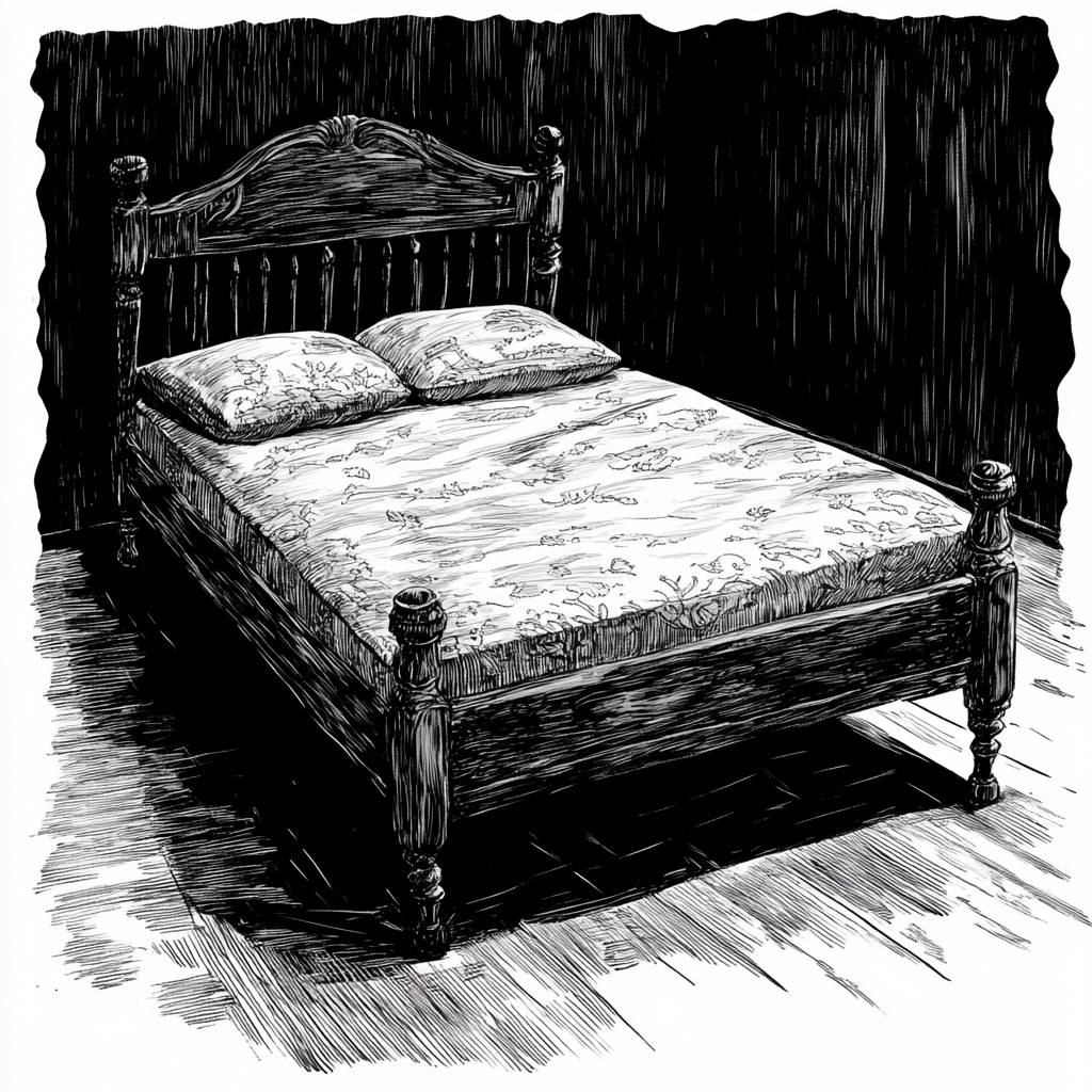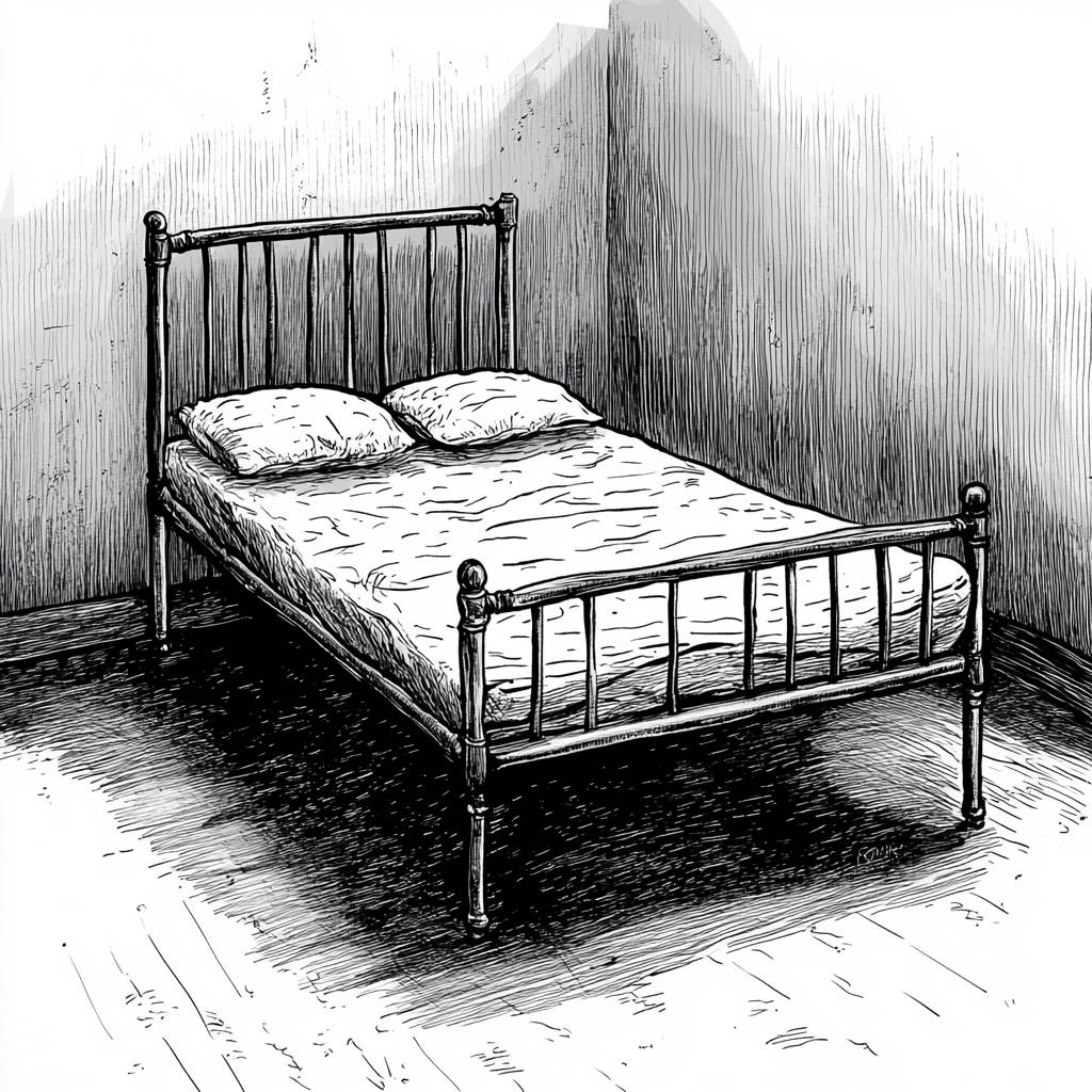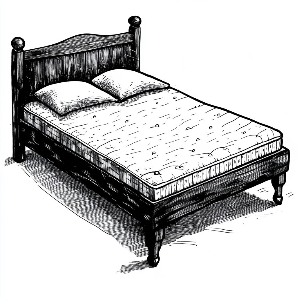 Black and white newspaper comic illustration of a bed frame with a mattress --v 6.1