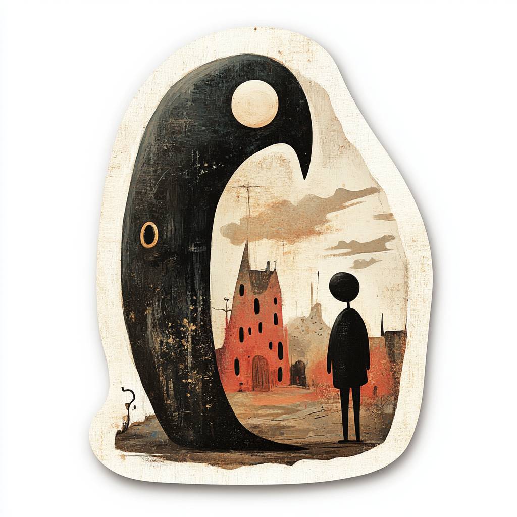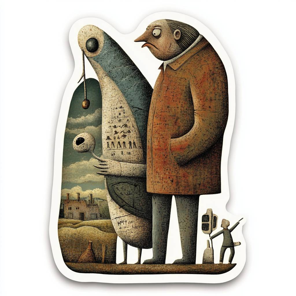 Shaun Tan’s cut sticker depicting Shaun Tan’s character and man, solid background, with white borders --v 6.1