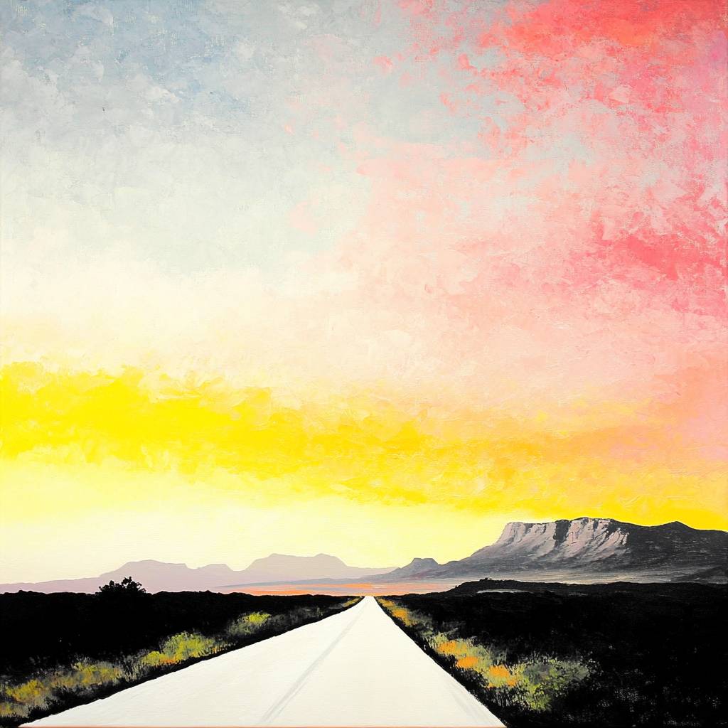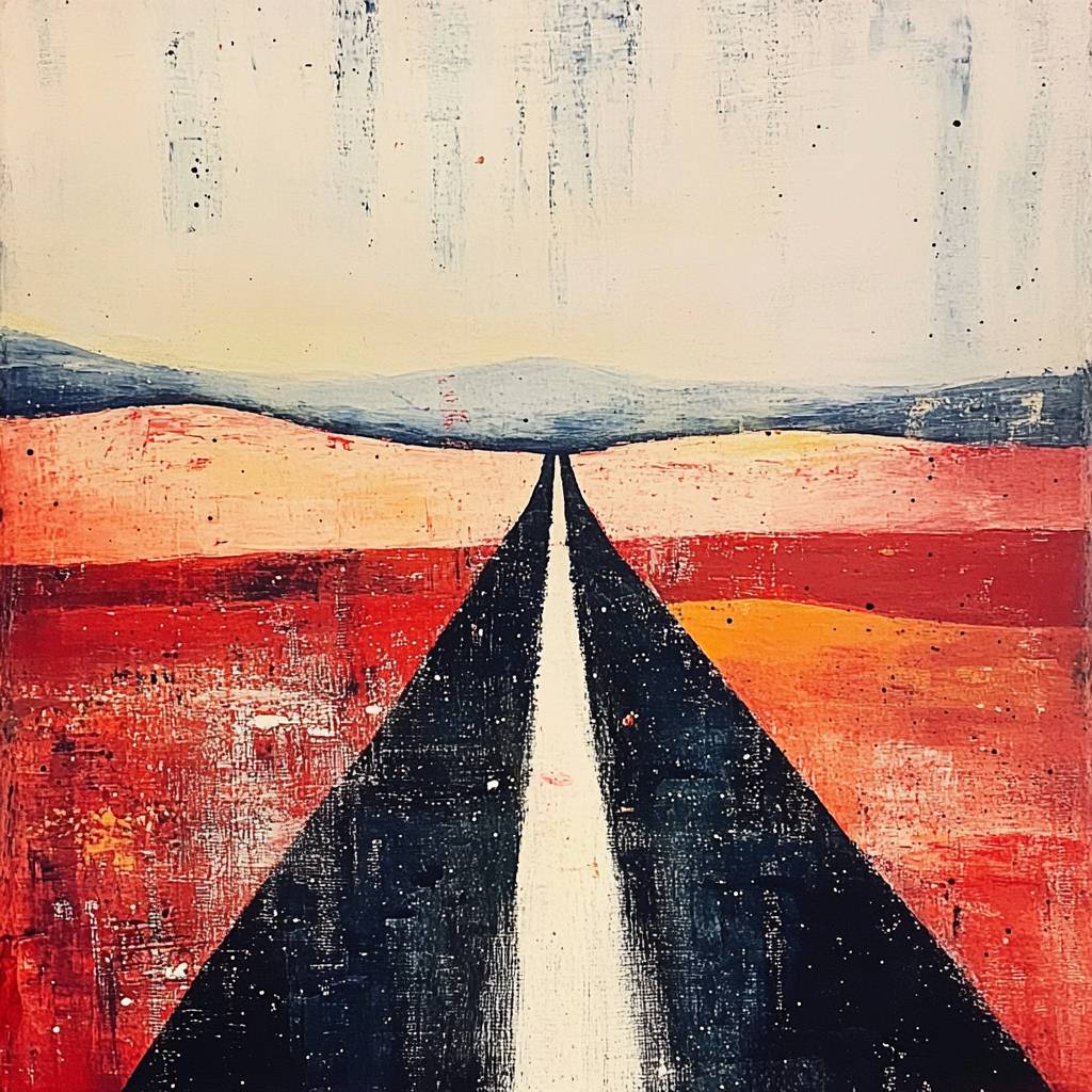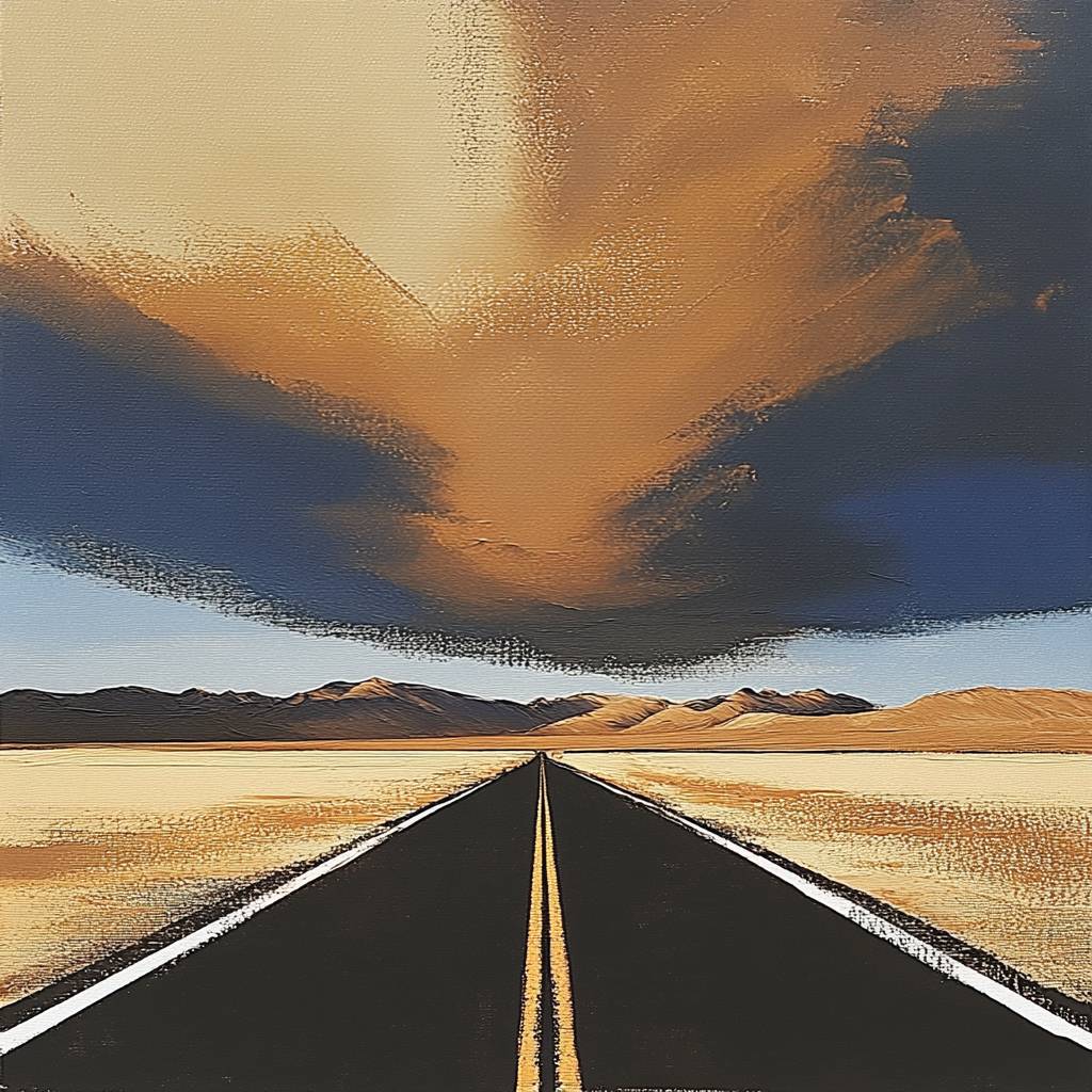 Painting of a long desert road just before dusk, looks like route 66, atmospheric --chaos 90 --profile xdz31ot z8m8cq7 --v 6.1