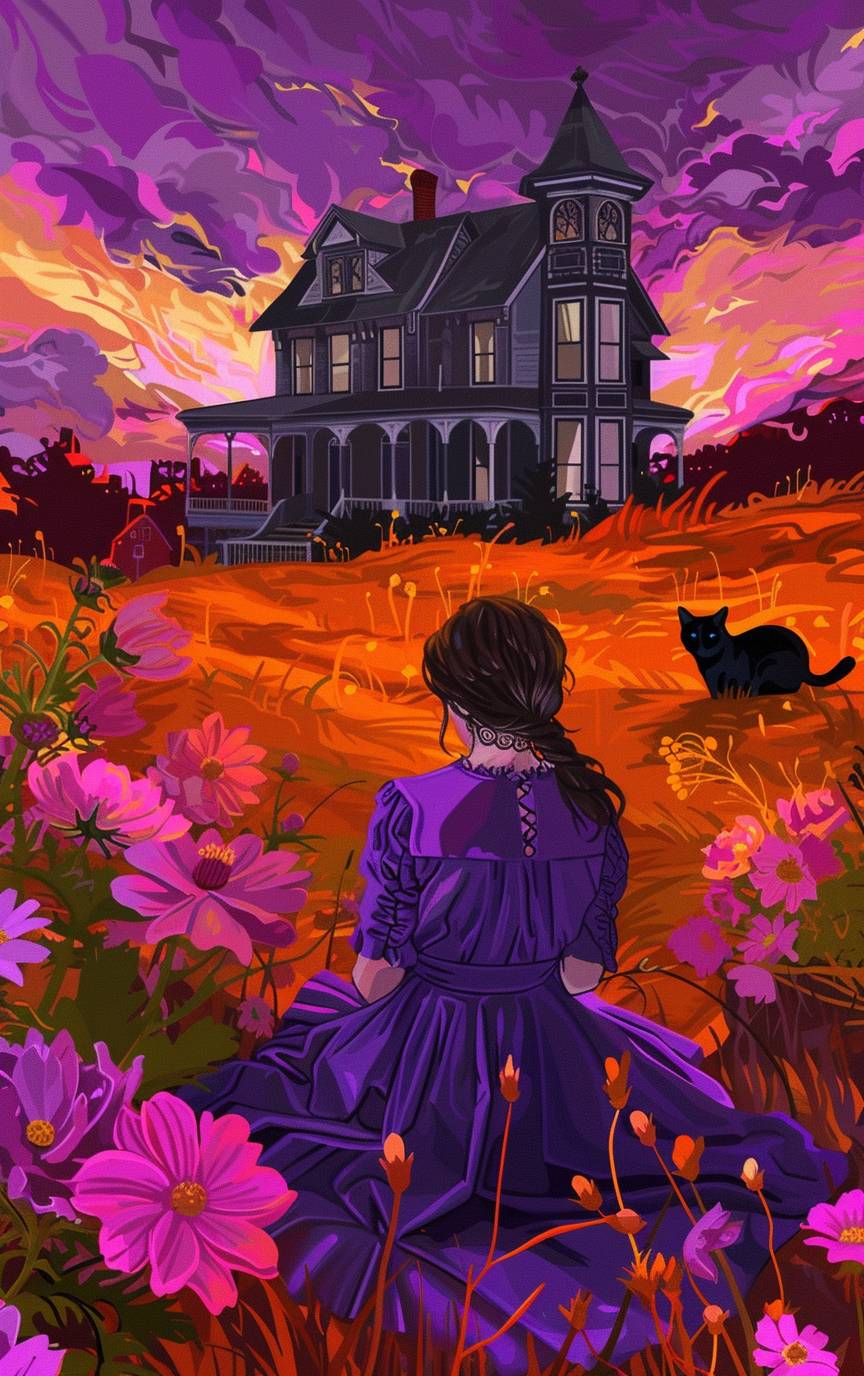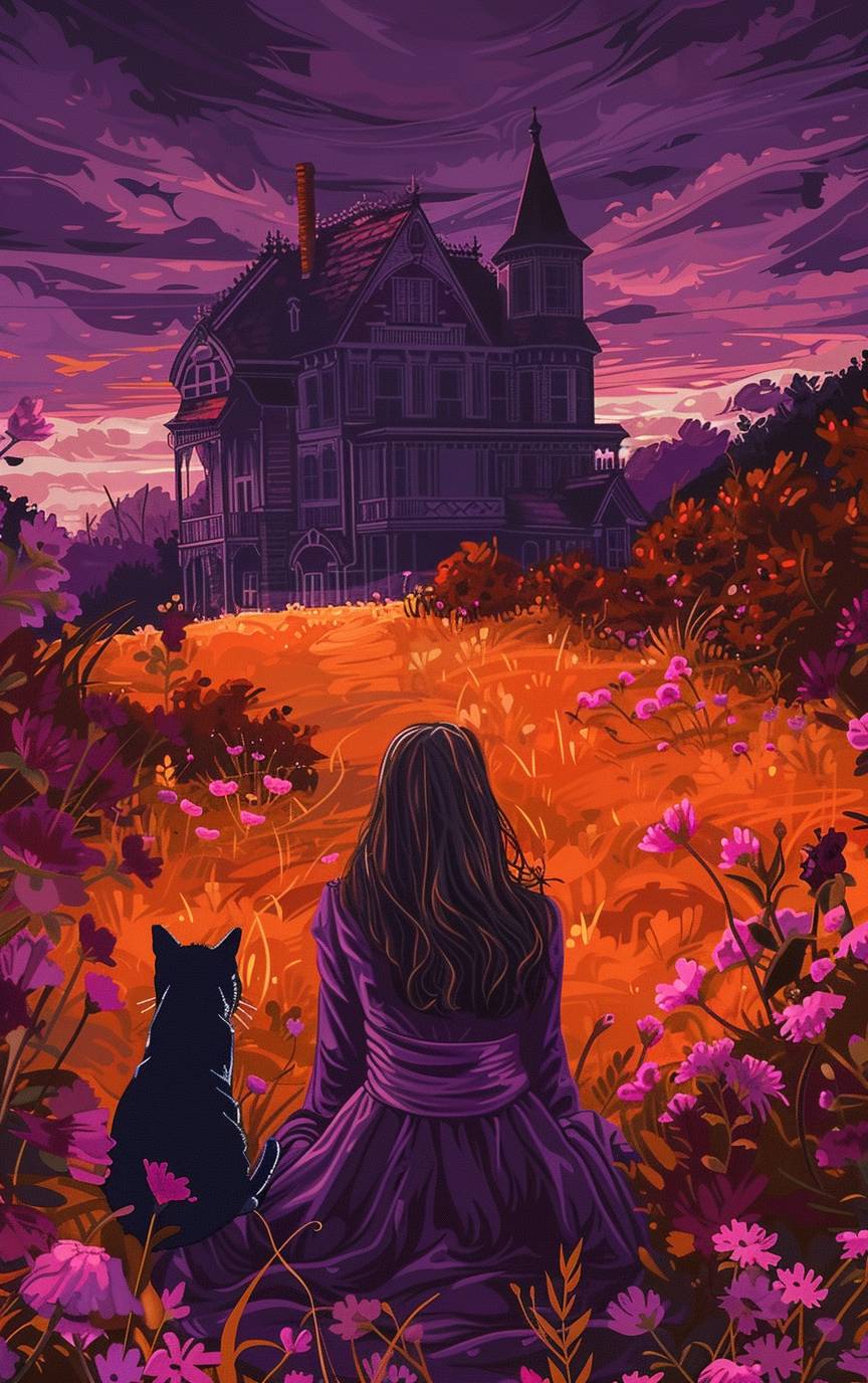 在深紫色的天空下,一个穿着紫色裙子的女孩坐在暗橙色的田野中,面前有一只黑猫和一些粉色花朵,背景是一栋黑色的维多利亚式房子,色调和谐,仿佛落日余晖。