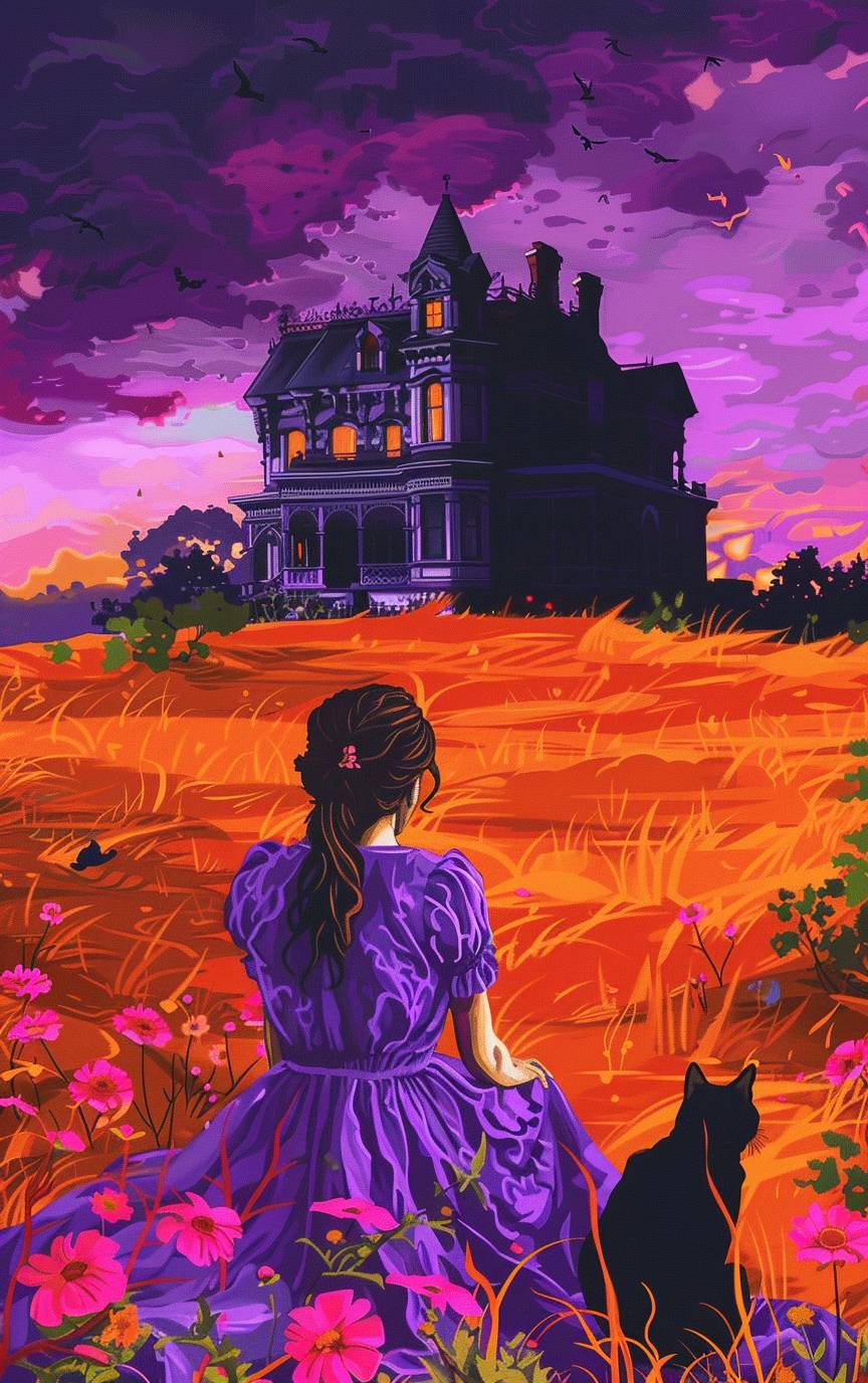 穿着紫色连衣裙,坐在深橙色的田野中,面前有一只黑猫和粉色花朵,背景是一座黑色的维多利亚风格房子。深紫色的天空,夕阳色调的调色板。纯色块。平衡的构图。