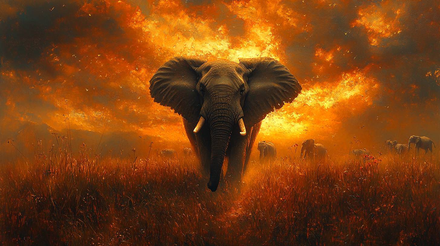 一幅梦幻超现实主义的油画,描绘了一只雄伟的象在超现实的外星景观中漂浮。