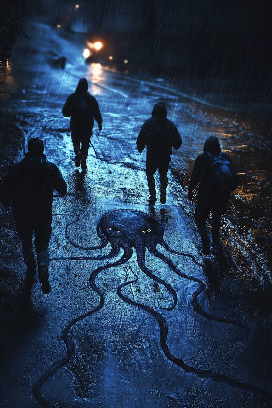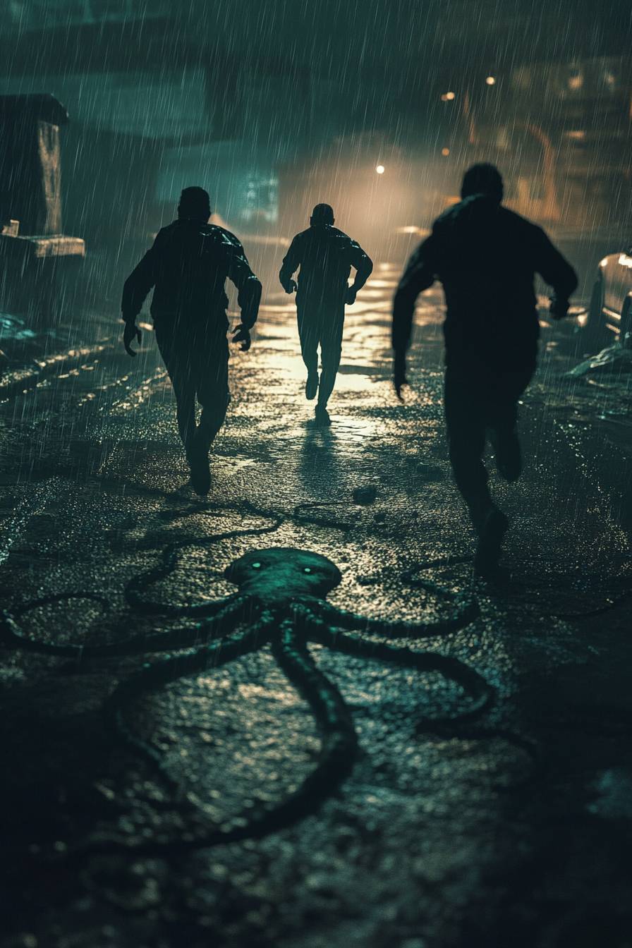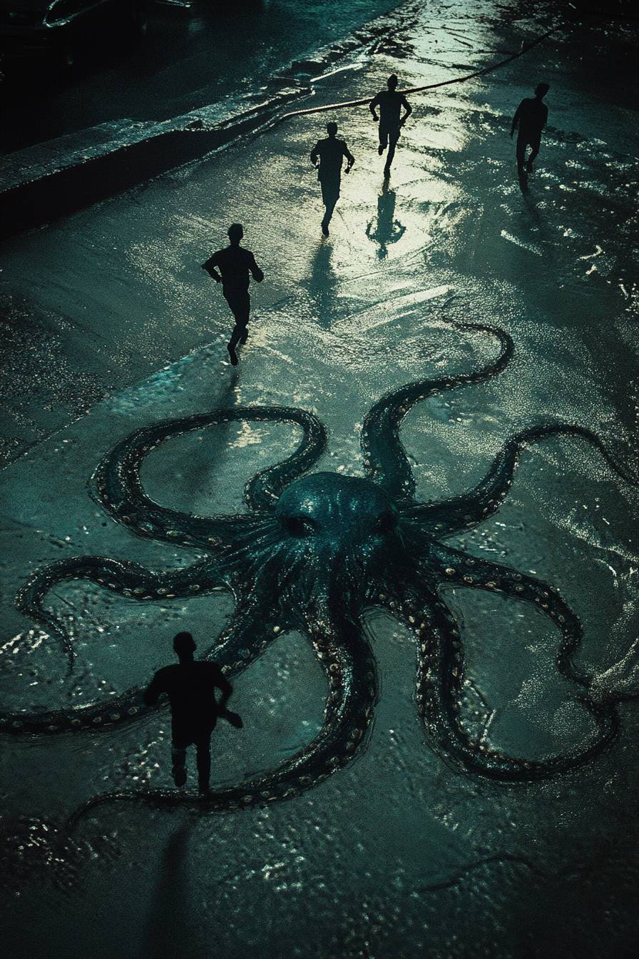 Squid Game final challenge, dark, rainy night, players running, giant squid drawn on the ground, tense mood, dramatic lighting --ar 2:3