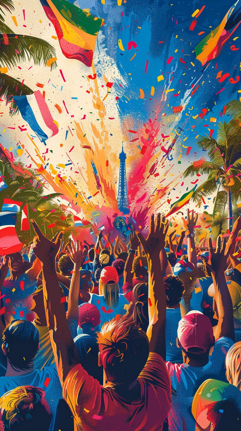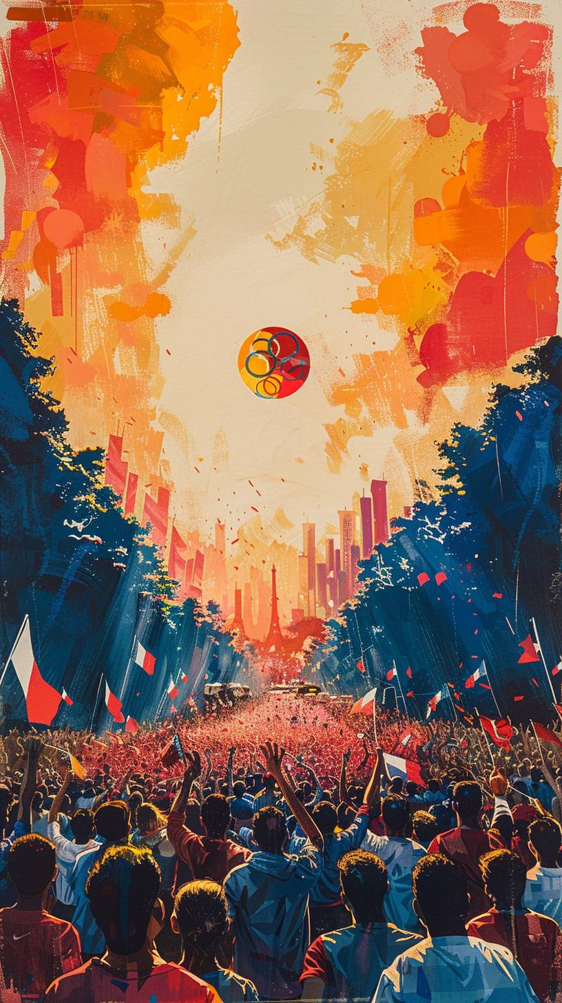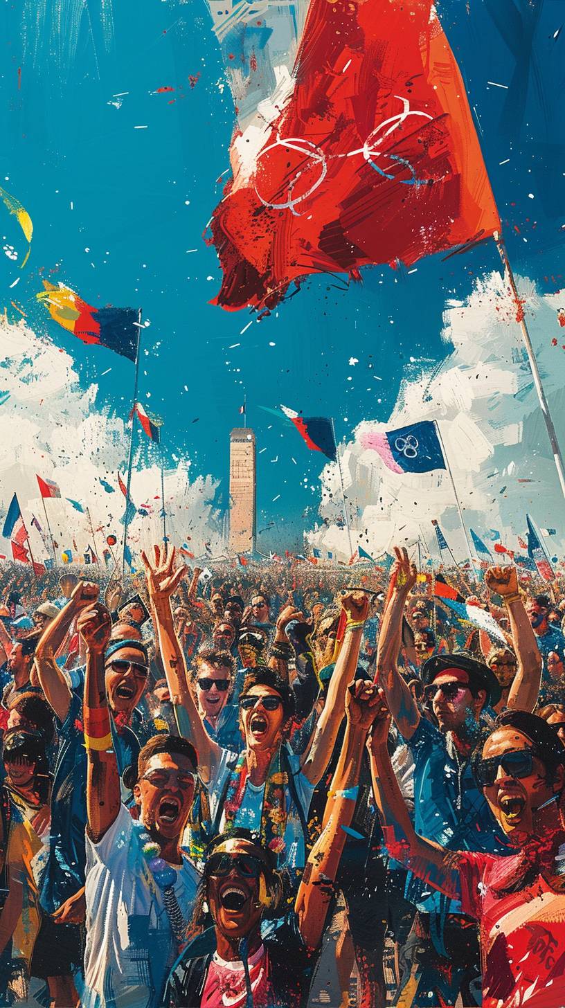 Design a promotional poster featuring a large crowd of people from various nations joyously running and celebrating. The poster should include the phrases 'Bienvenue aux Jeux Olympiques' and 'Paris Ville candidate Jeux Olympiques de 2024'. The scene should be filled with people in colorful athletic wear on a stage, with a vibrant logo indicating Paris as a candidate city for the 2024 Olympics. The poster should reflect the Olympic rings and convey a lively, energetic atmosphere. In the foreground, there should be people carrying flags from different countries --style raw --ar 9:16 --stylize 800 --v 6.0