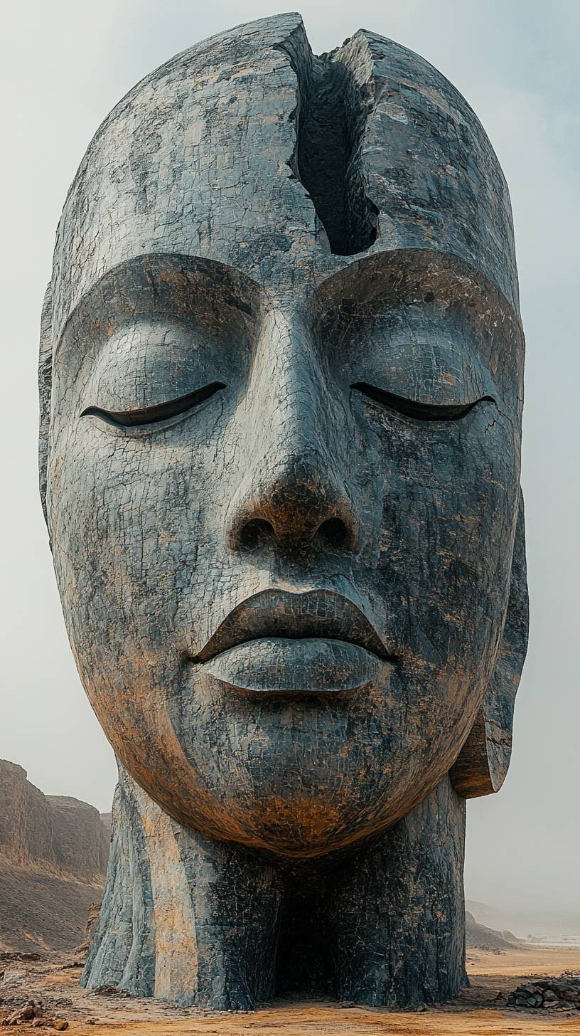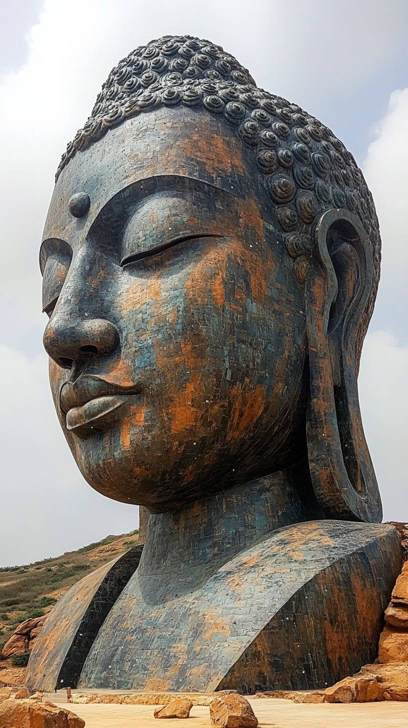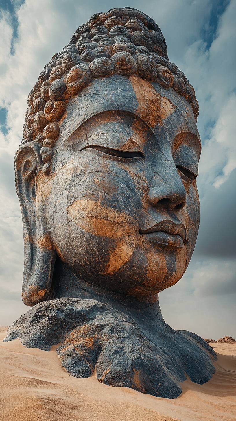 The ancient sleeping statue of Buddha in China, with a huge statue head and complex design, sleeps in the Sahara Desert, with a huge scale and ethereal sky, inspired by great fantasy works --ar 9:16 --style raw --stylize 750 --v 6.1