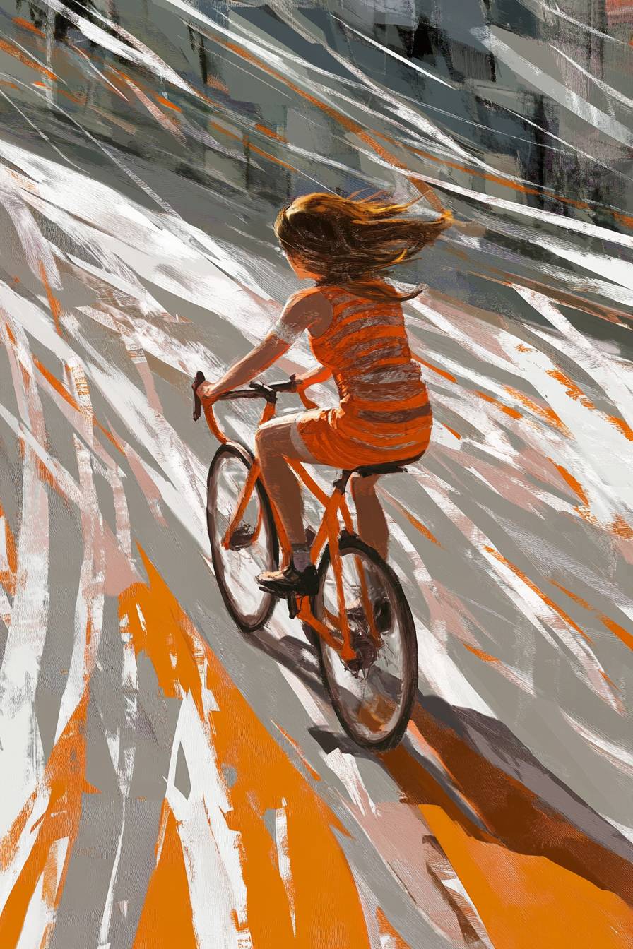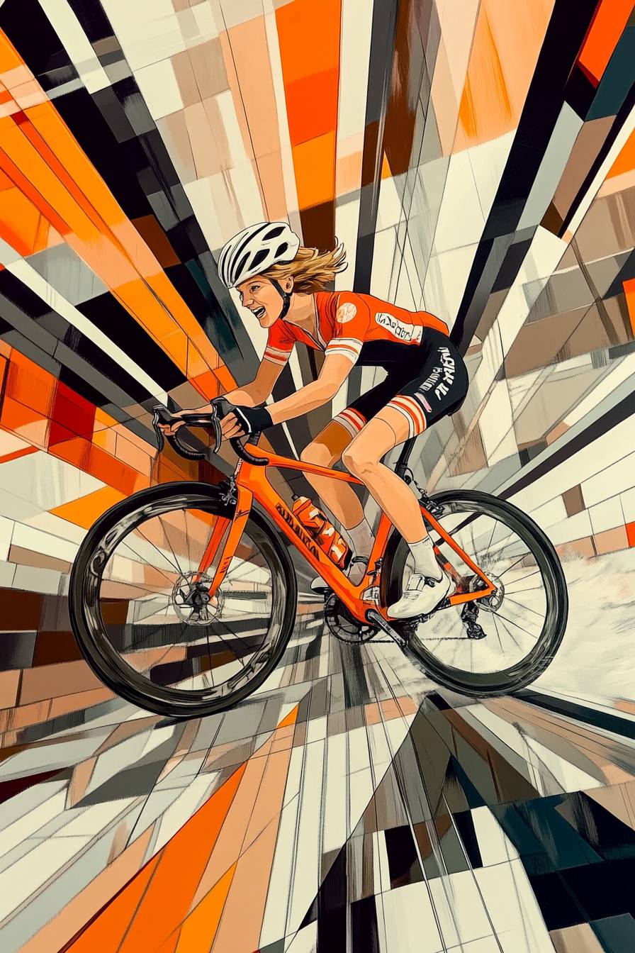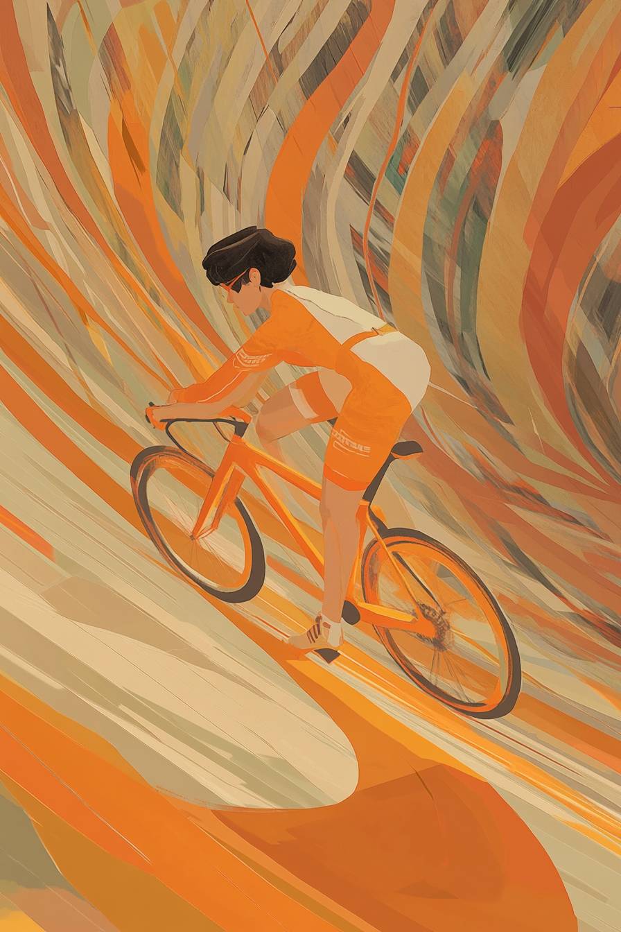 一幅数字艺术作品,表现一名自行车手在环法自行车赛中下坡的场景。我们可以看到这名骑手骑在一辆橙色自行车上,正在留下速度的轨迹。这种风格受到超现实主义运动的影响,融合了波普艺术、赛博朋克美学和超现实主义纹理的元素。作品中包含几何形状,皮肤质感呈现出光泽感,调色板结合了黑、白、灰、黄、红、橙、绿、粉、紫、天蓝、靛蓝、海军、灰和银色。史诗般的构图。