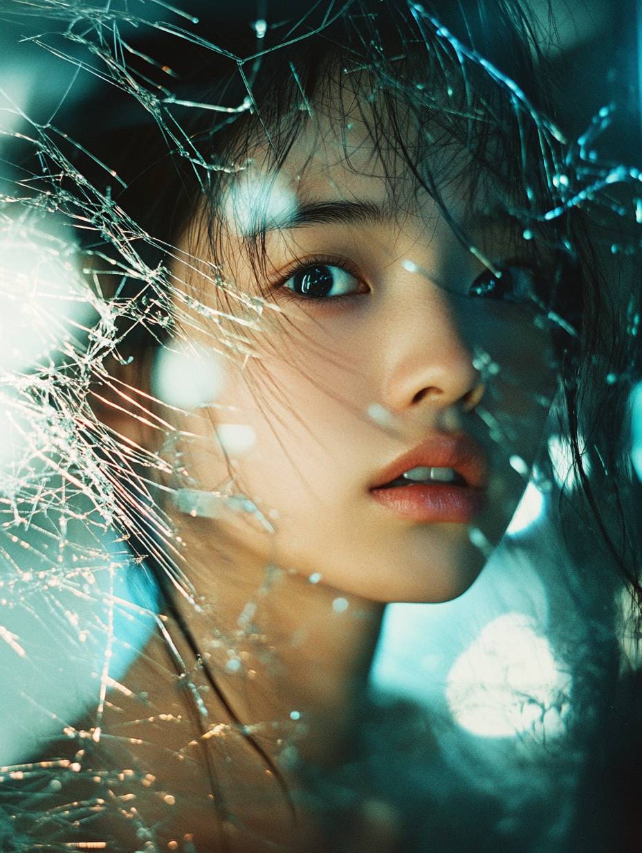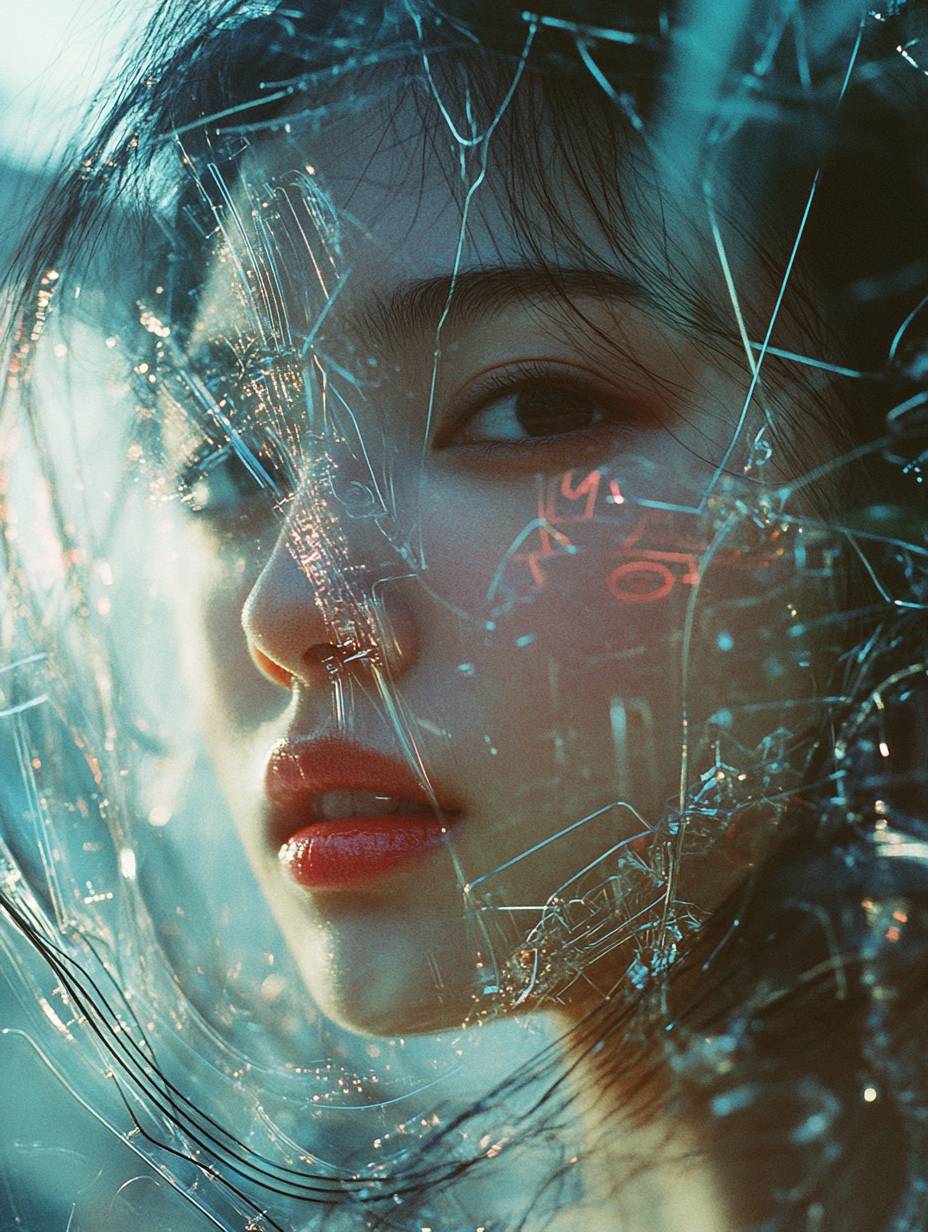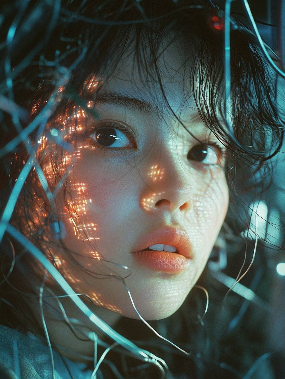 一位年轻的亚洲女性与混乱的电线和齿轮融为一体,她的表情空洞,金属碎片在她的皮肤上形成,酷烈的直射光线穿透雾气照亮了她,画面使用Kodak Ektar 100胶卷拍摄,质感颗粒感十足。