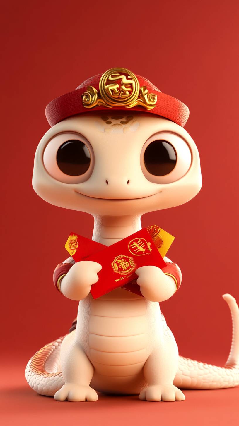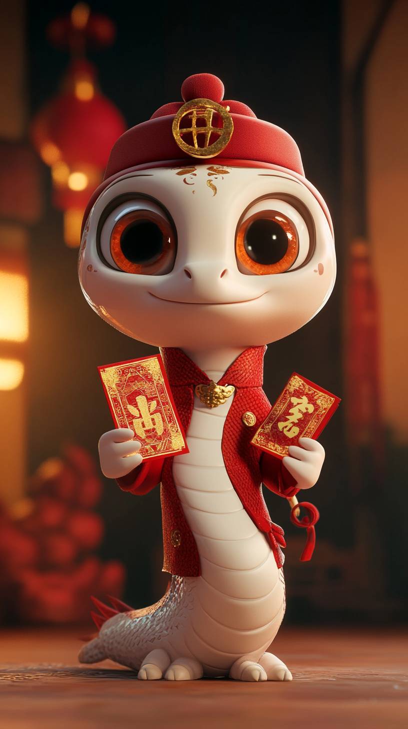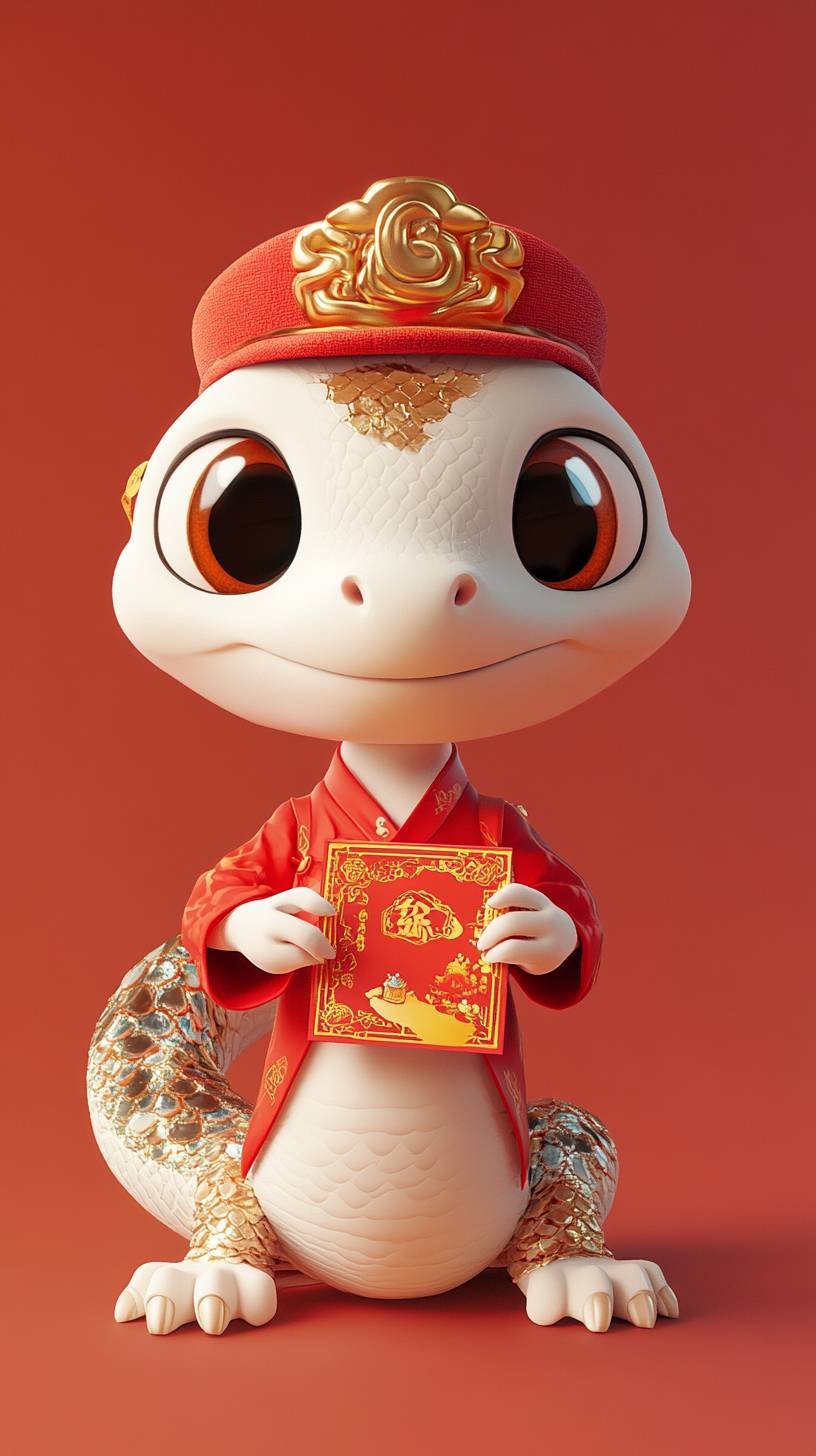 A cute white snake wearing red and a hat, holding Chinese New Year cards in its hands, in the style of Pixar with big eyes and a happy expression. The cartoon character design features a gold ingot decoration on the head of the dragon-like body, with exquisite details. The full-body shot is rendered in warm colors against an indoor, solid color background using 3D rendering and high-definition OC (Offline Cinematic) rendering. --ar 9:16 --style raw