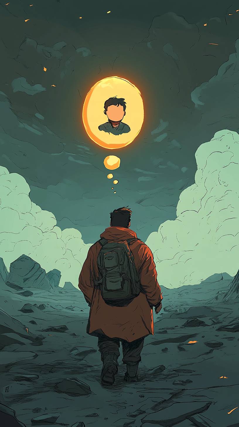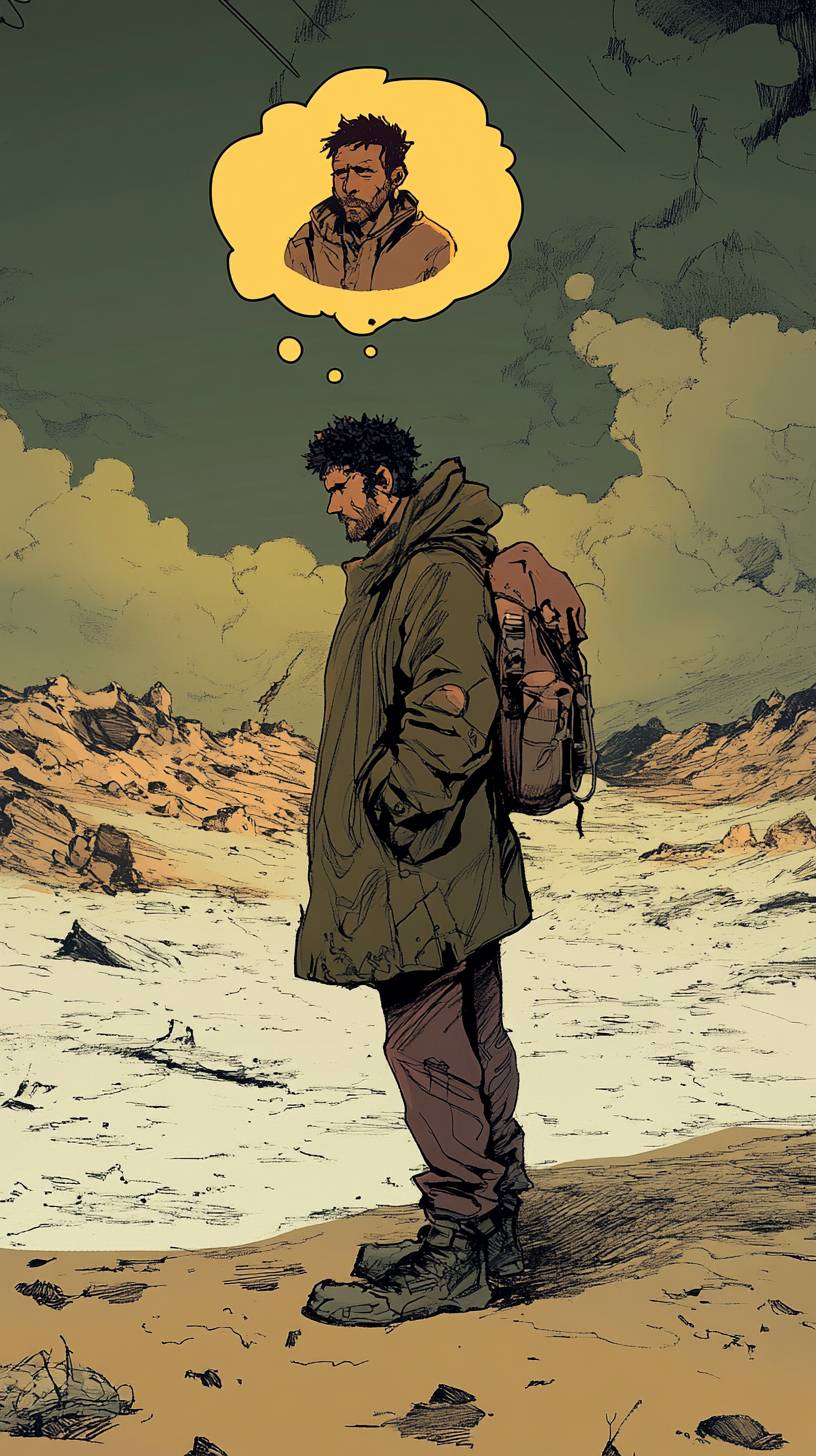 一幅以弗兰克·米勒风格创作的2D卡通插图,描绘了一名男子走在荒凉而神秘的区域景观中。他穿着一件粗糙、风化的外套,背着一个小背包,身体微微驼背,脸上带着阴郁的表情。一个思维气泡悬浮在他头顶,描绘出他微笑的兄弟的柔和发光形象,镶嵌在温暖而怀旧的色调中。区域的地形 jagged 和超现实,附近漂浮着发光的异常现象,雾蒙蒙的阴影在地面上伸展。天空阴沉,有旋转的云彩和诡异的渐变,强调着他记忆的情感重担,粗犷的轮廓、戏剧性的灯光和丰富的漫画书阴影。