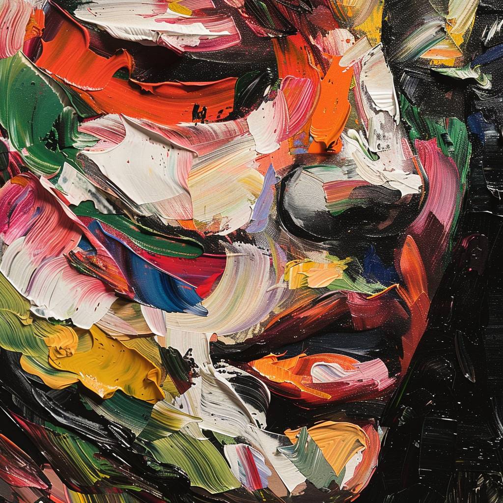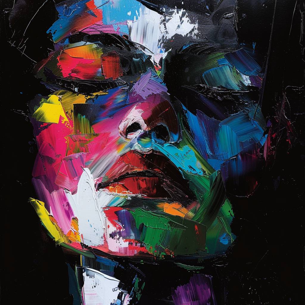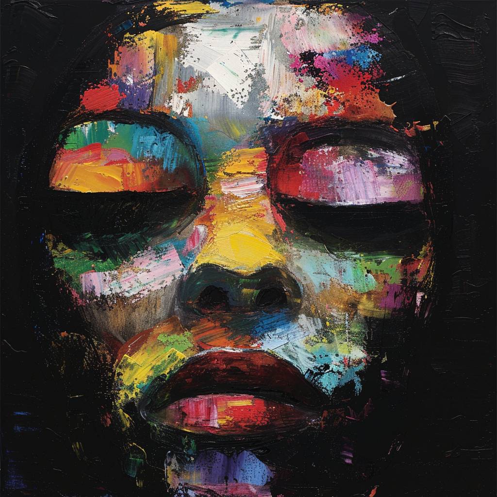 The cover of the book is made in the style of oil painting, featuring an abstract portrait with a black background and a colorful palette. The face has multiple colors, including reds, yellows, greens, blues, white, pink, purple, etc.--ar 2:3 --v 6.0