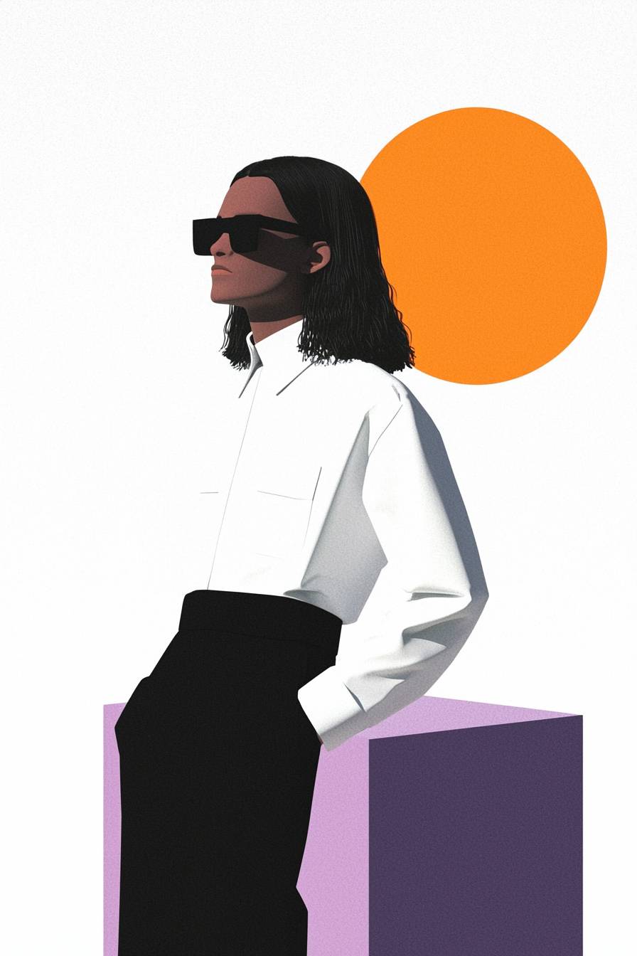 浅灰色调,涂色书页,搞笑卡通角色,时尚卡通女性,女性,未指定种族,25岁,金发,尖尖鼻,夸张的面部特征,修长的脖子, oversized 头,纤细的身体类型,大眼睛,尖鼻子,抿嘴,冷漠的表情,这位卡通女性穿着白色荷叶边上衣,搭配大圆形太阳镜,白色毛皮外套,侧面姿势,明亮的白色背景