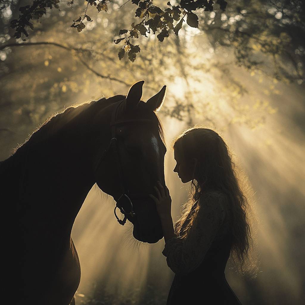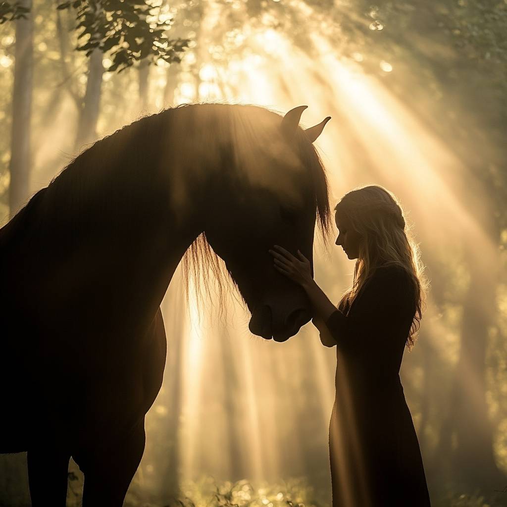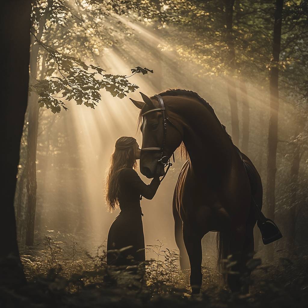 一个独特的视角,一位骑手轻柔地触碰马的额头,彼此的眼神在静谧的理解中交汇。背景是一片在黎明时分的薄雾森林空地,阳光透过树木,洒下柔和的、如梦似幻的光辉,象征着信任与和谐。
