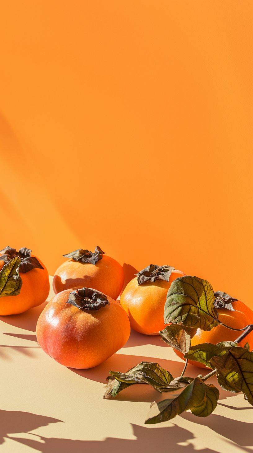 Persimmons on the table, persimmon poster, sunshine light, rainbow, dreamy, solid color background, light orange background, gorgeous colors, minimalism --ar 9:16 --v 6.0 --style raw --s 40