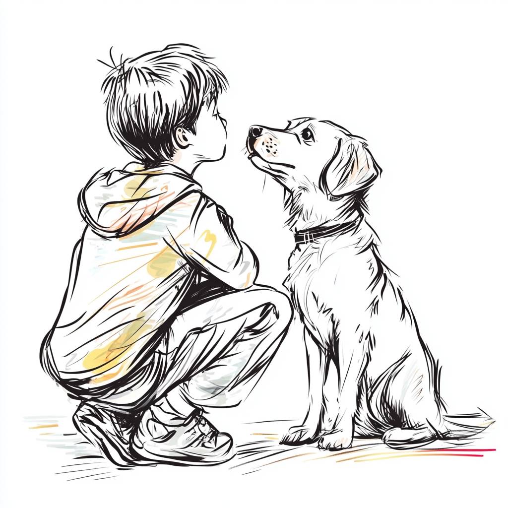 男孩和狗,签名笔触,黑色线条,白色背景,间歇性的黑线,简单的线条画,矢量插图,平面设计,白色背景,有色线条,涂鸦风格,简单上色。