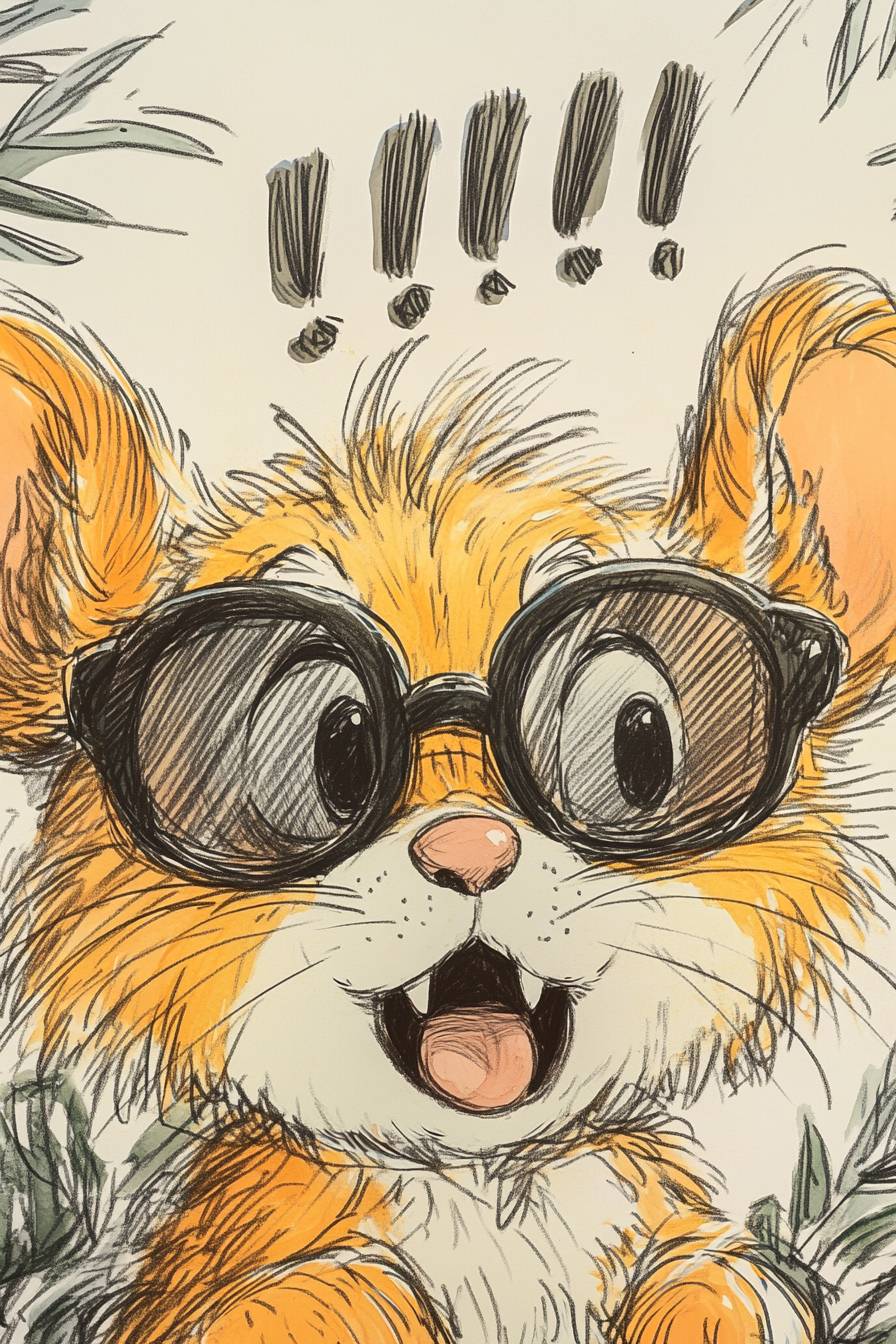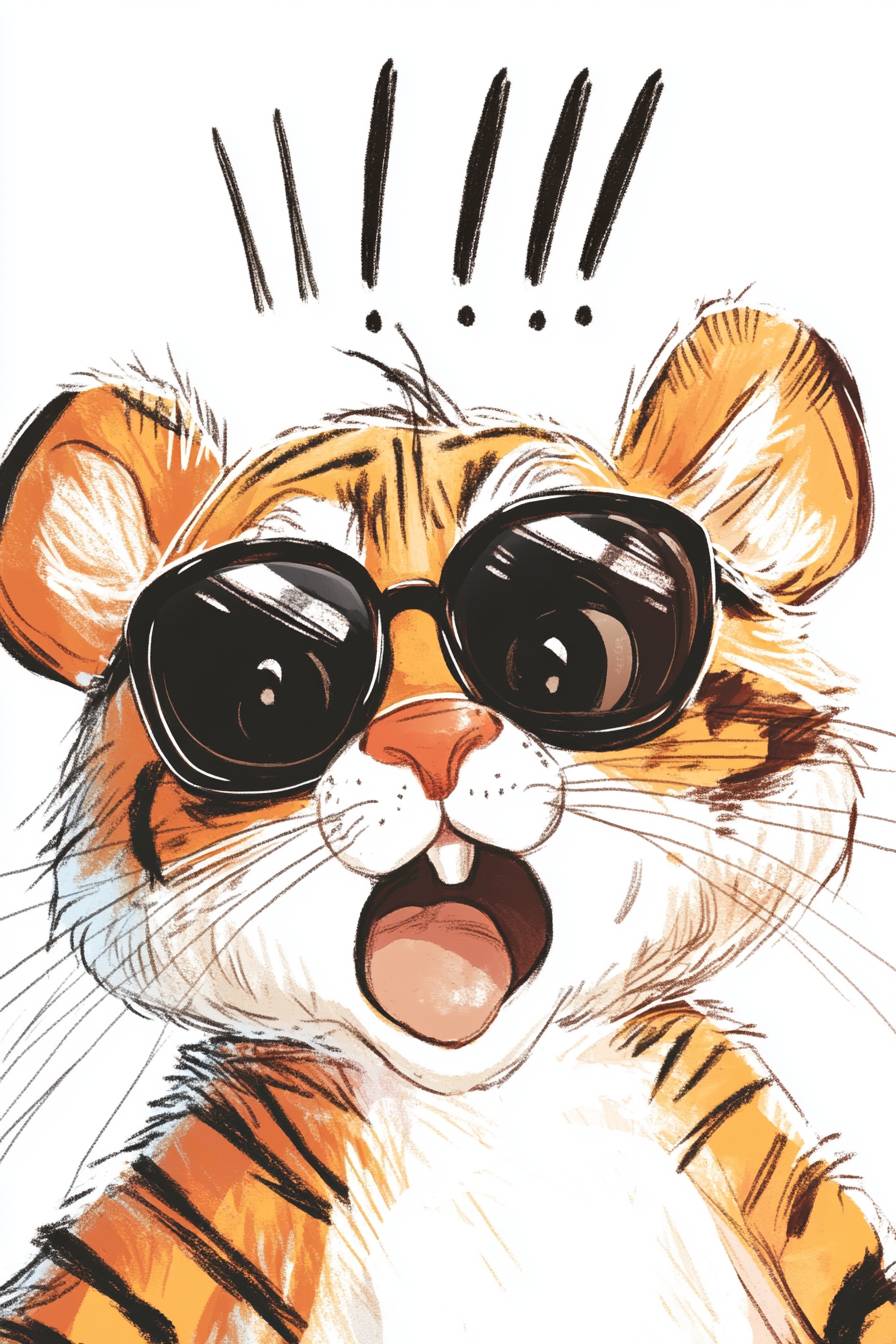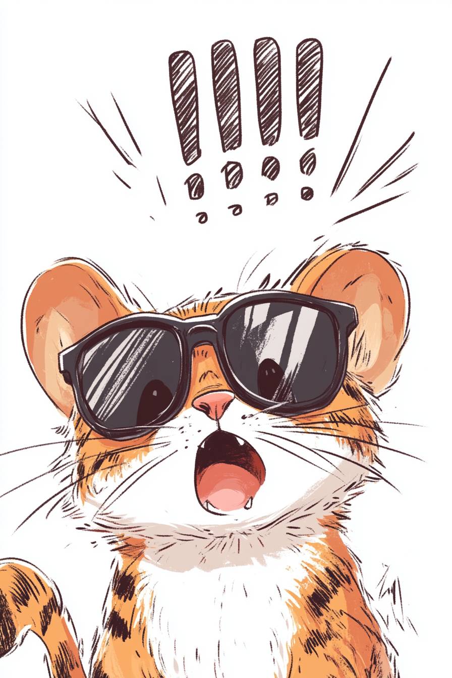 A hand-drawn, cartoon-style little mouse on a white background, with a close-up of a surprised anthropomorphized little tiger wearing black sunglasses, slightly bowing its head, with a round mouth, looking astonished. Above the white background, the text "!!!" is written. The illustration features lines and coloring. --ar 2:3 --v 6.1