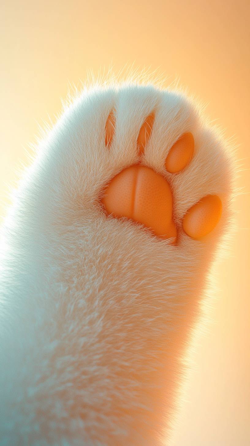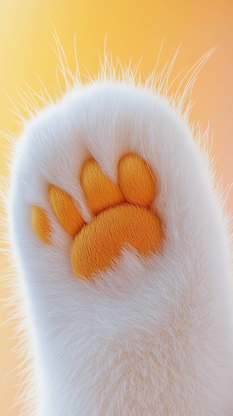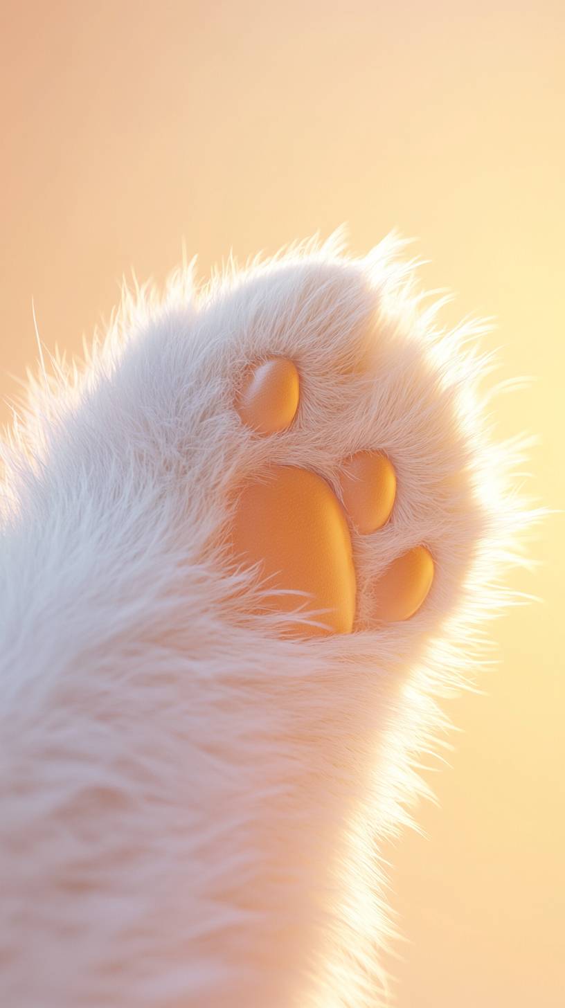 A close-up view from the back of a cat's paw, featuring a white cat paw with dreamy, plush fur and smooth texture. The background is a gradient of peach yellow and white glowing palette, creating a cute, cartoonish, and dreamy light. The image is focused, clear, high-quality for commercial use, with bright colors, high definition, a sense of space, ultra-high precision, 3D modeling, C4D rendering, and intricate details, resulting in a beautifully rendered scene. --ar 9:16 --v 6.1