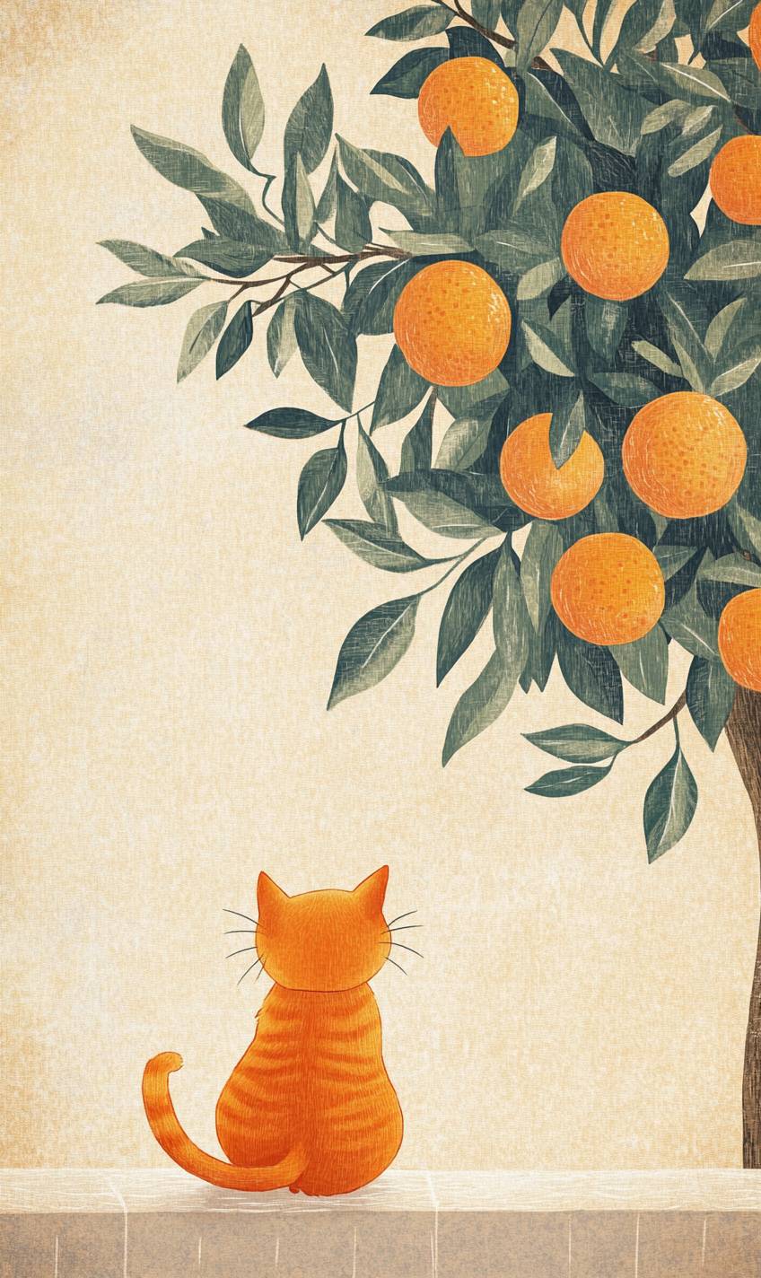 在米色的背景上,画布上留有许多空白,插图温暖可爱。场景中,一只肥胖的橙色猫咪背对观众,其丰满的身躯显得特别可爱,正轻轻跳上墙面,露出顽皮的背影。图像右侧是一棵硕果累累的大树,绿叶点缀其中,水果看起来成熟,象征着富饶和好运。蓝色的天空上点缀着几朵白云,营造出温暖宁静的氛围。