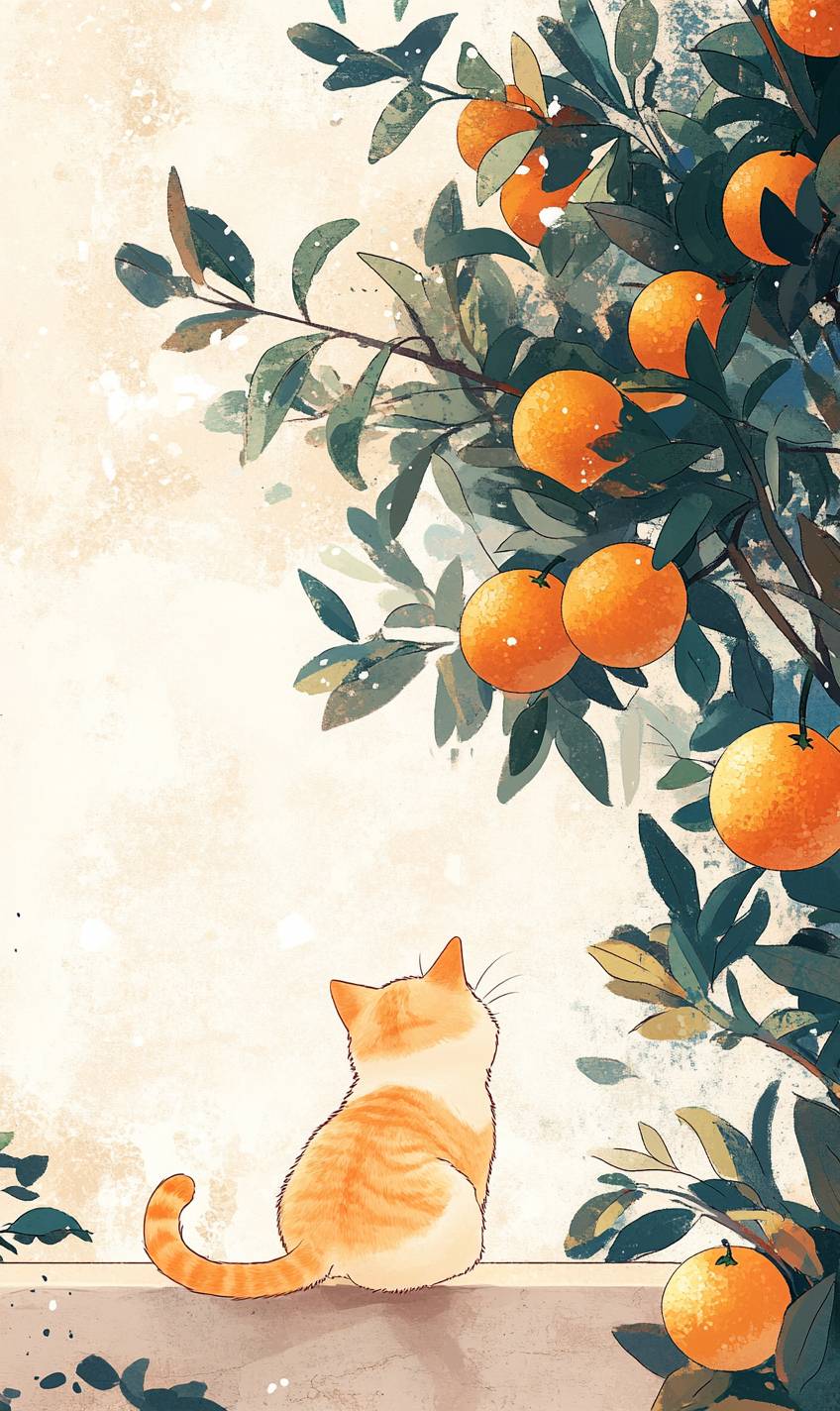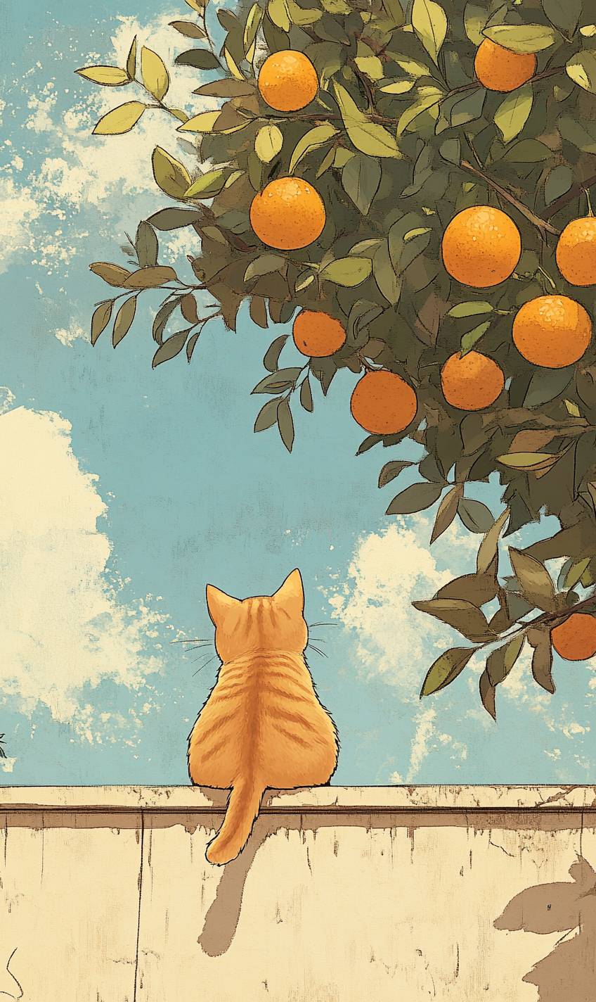 On a beige background with plenty of blank space on the canvas, the illustration is warm and cute. In the scene, a chubby orange cat is facing away from the audience, its plump body looking particularly adorable as it gently jumps up onto the wall, revealing a playful backside. On the right side of the image is a large tree laden with oranges, with green leaves adding a touch of color, and the fruits appearing ripe, symbolizing abundance and good luck. The blue sky adorned with a few white clouds creates a warm and tranquil atmosphere. --v 6.1 --ar 3:5