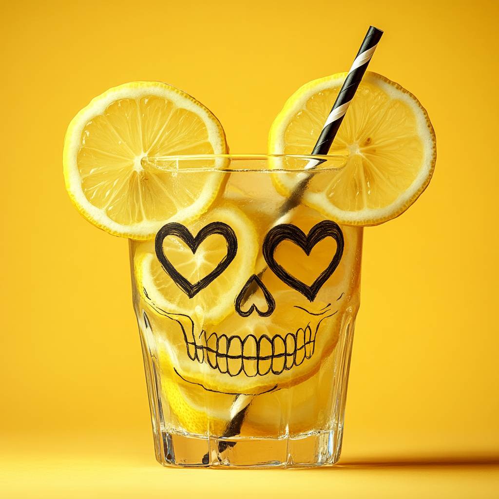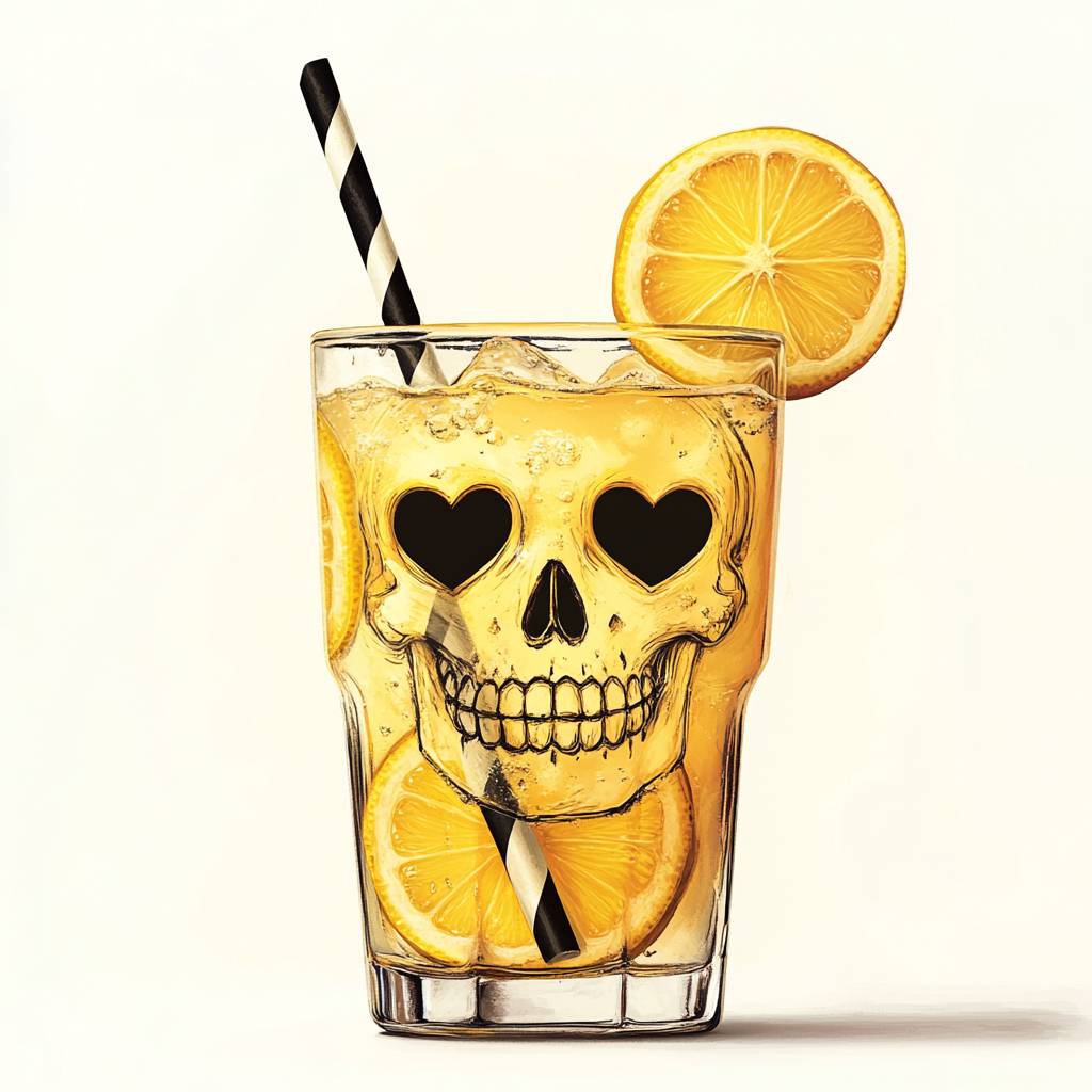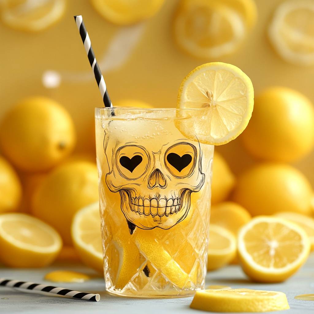 eye sockets shaped like hearts, Skull-shaped lemon slice, glass of lemonade, lemon slices, black and white striped straw, simple 2D art design --v 6.1 --s 250