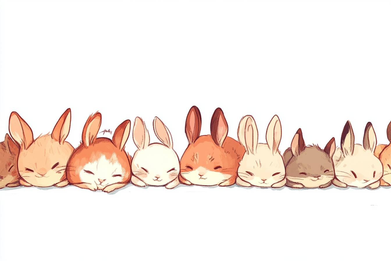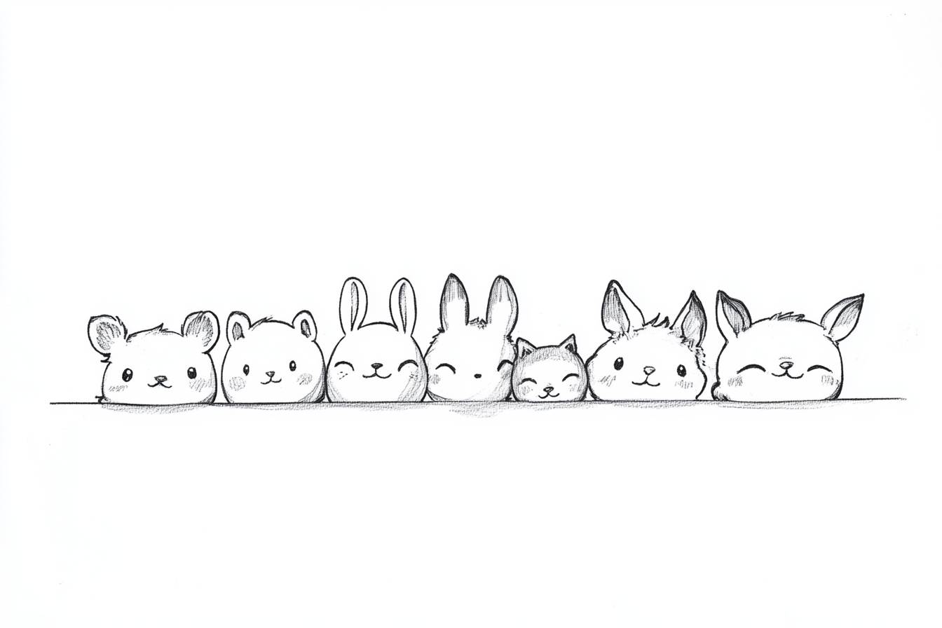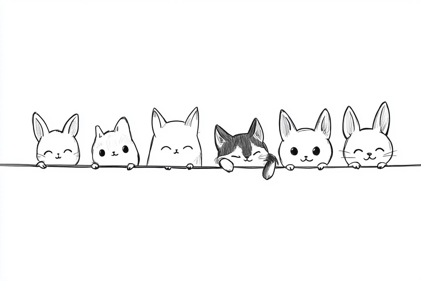 A simple drawing of a row of cute little animal heads resting on a straight line. --ar 3:2 --v 6.1