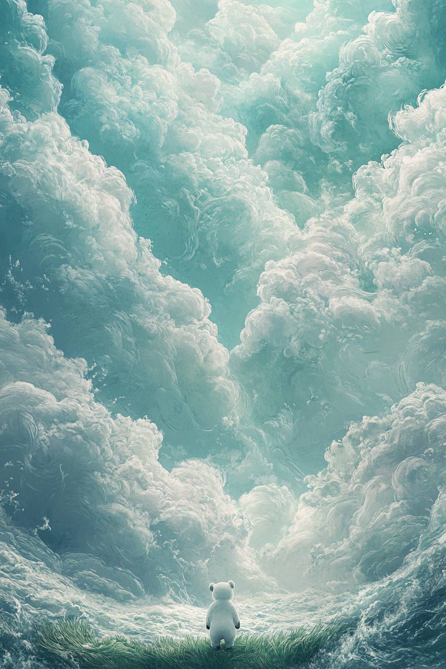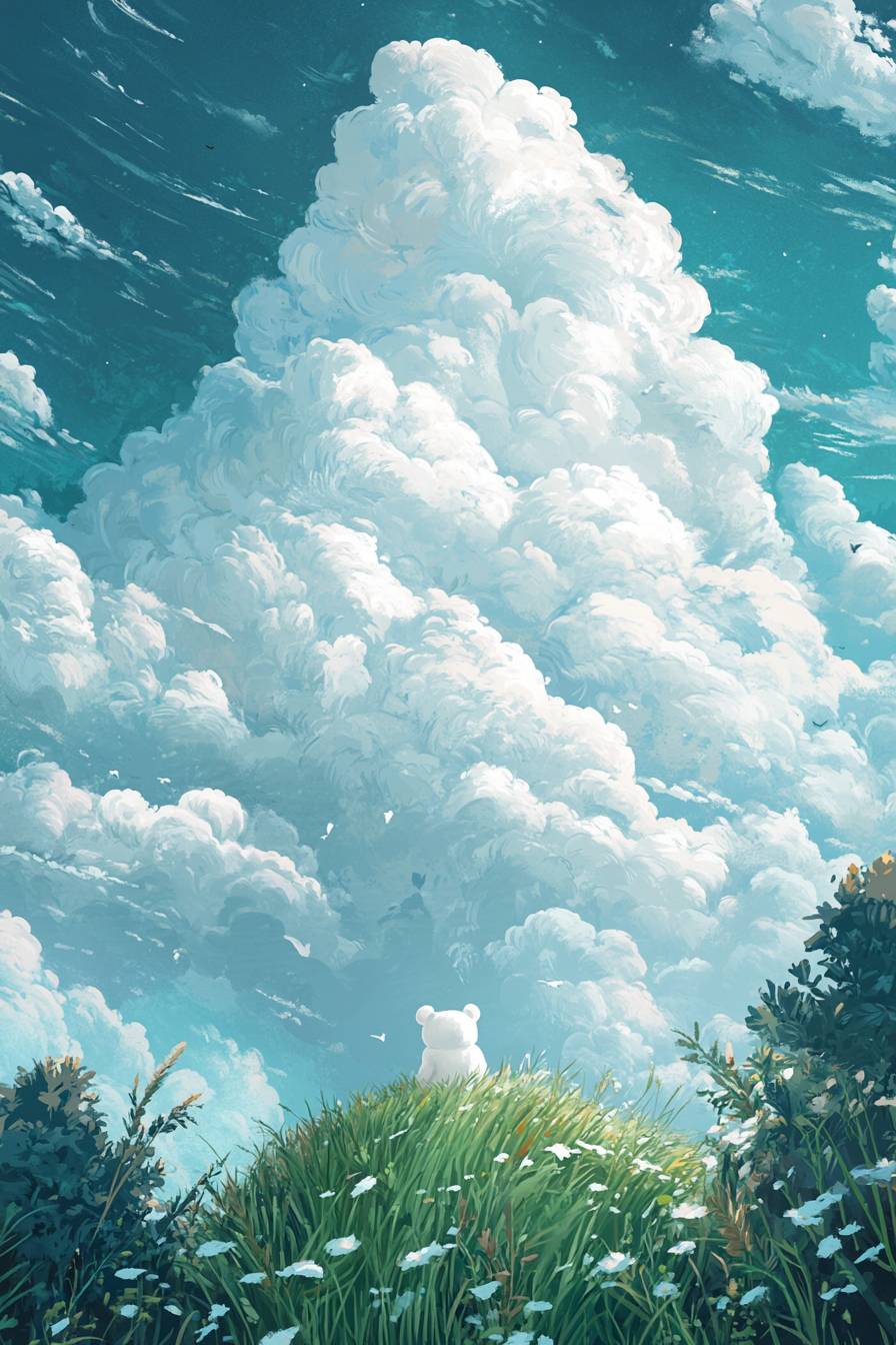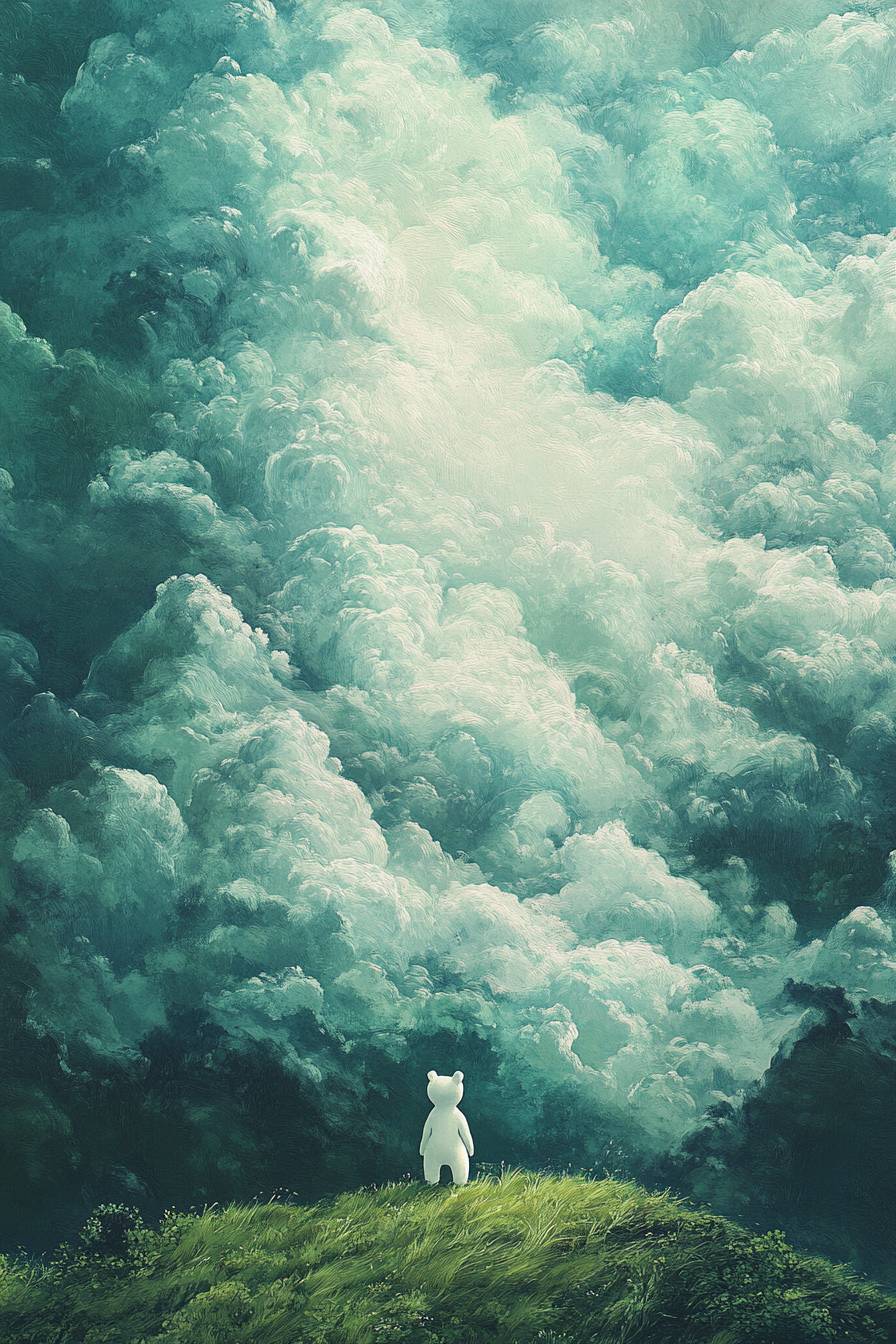 这幅插图展示了一只微型的白色泰迪熊在绿色草地上,背景是丰富的云海和蓝天,细节丰富,色彩低饱和度。