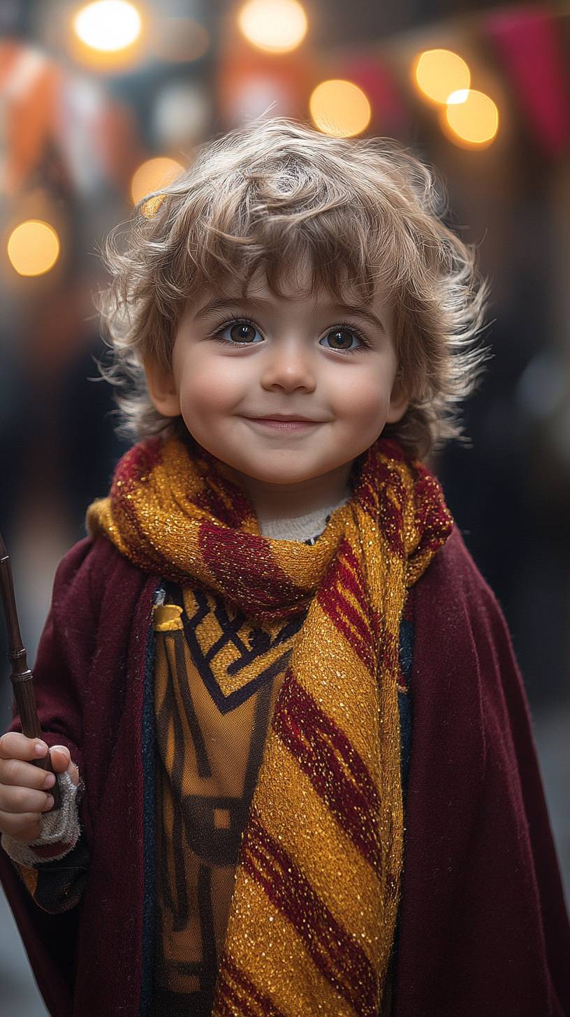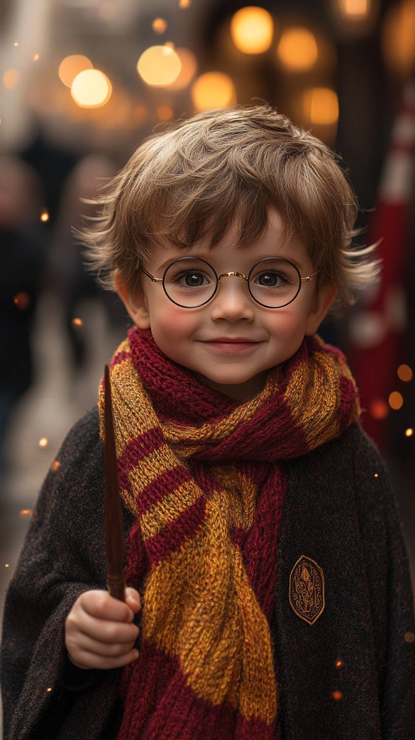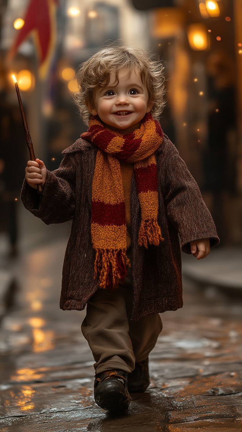 An adorable 18-month-old baby model walks with a charming smile down a magical Hogwarts-inspired catwalk. His outfit is a detailed Harry Potter cosplay, with a Gryffindor robe, red and gold striped scarf, magic wand in hand and his iconic round glasses. His light brown hair is slightly tousled, giving him a natural and magical look. The catwalk is decorated with floating candles, sparkles of magic in the air and Hogwarts house flags waving in the background. The bright lights change color, simulating an enchanted and immersive atmosphere. The baby walks with joy and charisma, showing off his outfit with tenderness while the audience applauds him with excitement. The background music is a magical and orchestral tone, immersing everyone in the experience of a parade full of fantasy and tenderness. --ar 9:16 --style raw --stylize 750 --v 6.1
