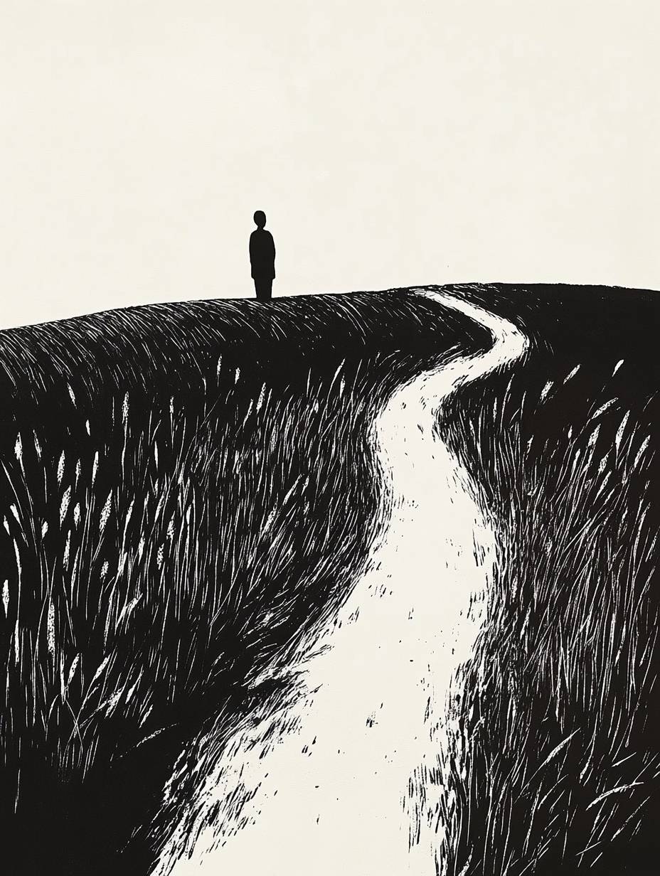 Woodcut, concise and clear carving marks, simple picture, a lonely person on the vast grassland looking into the distance. Only black and white. --ar 3:4 --stylize 222 --v 6.1