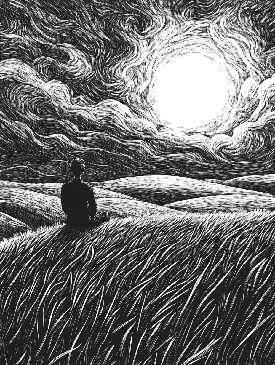 一位孤独的人在辽阔的草原上远望,黑白木刻画。