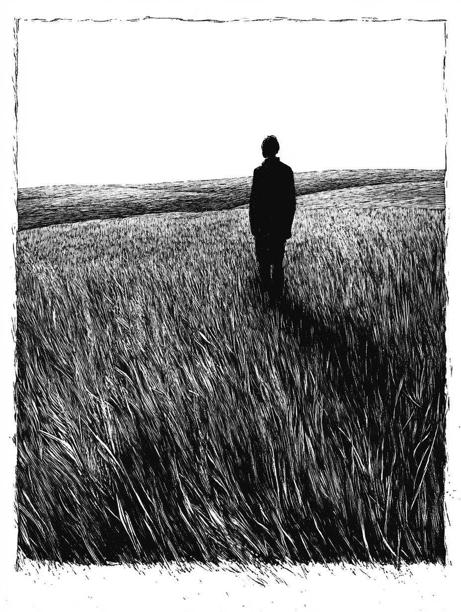 木刻,简洁明了的雕刻痕迹,简单的画面,一个孤独的人在广阔的草原上远望。只有黑白色。