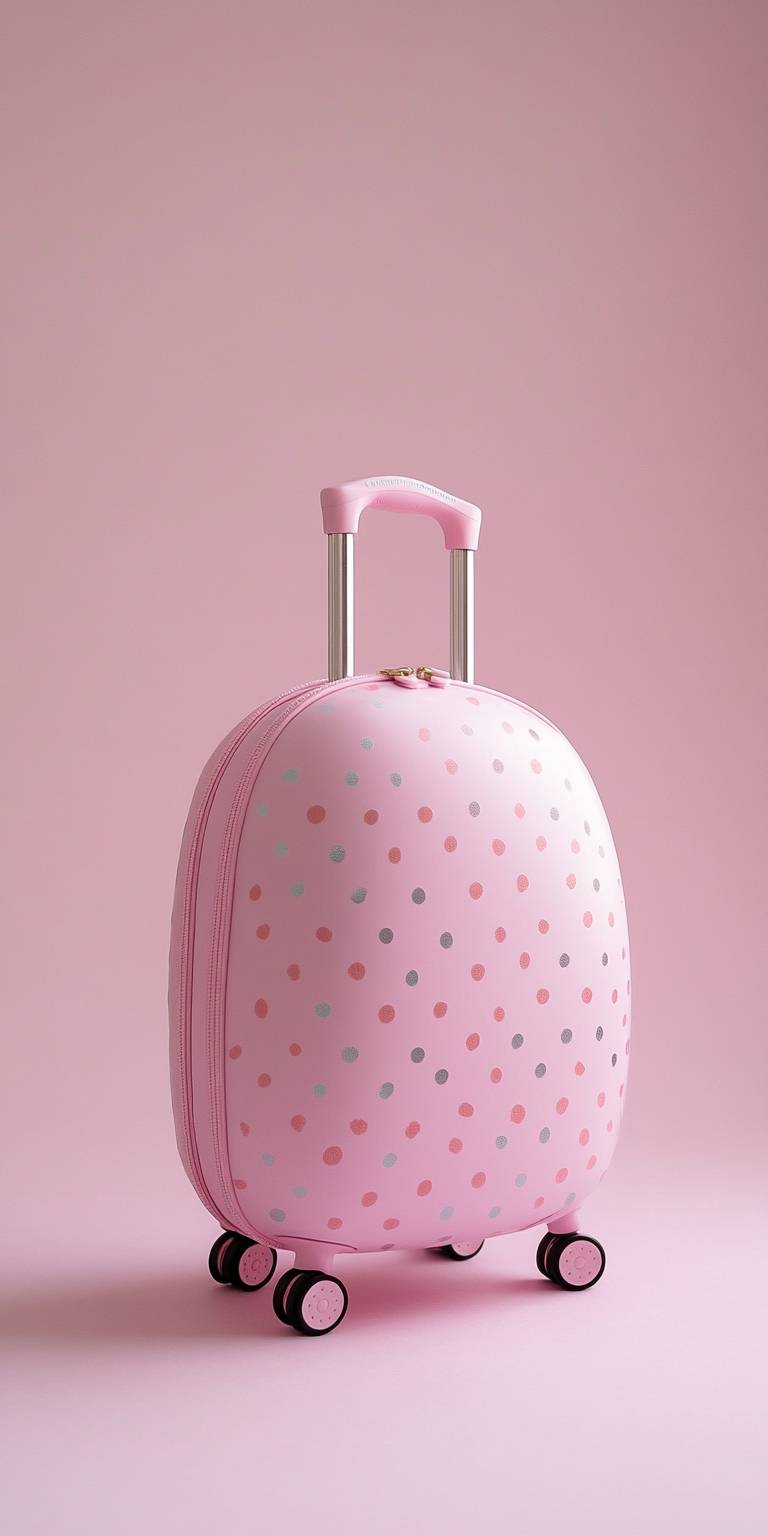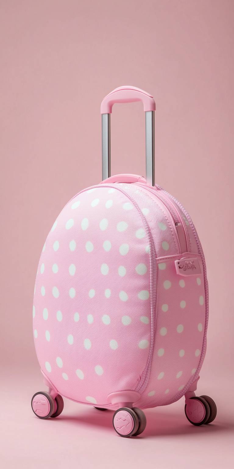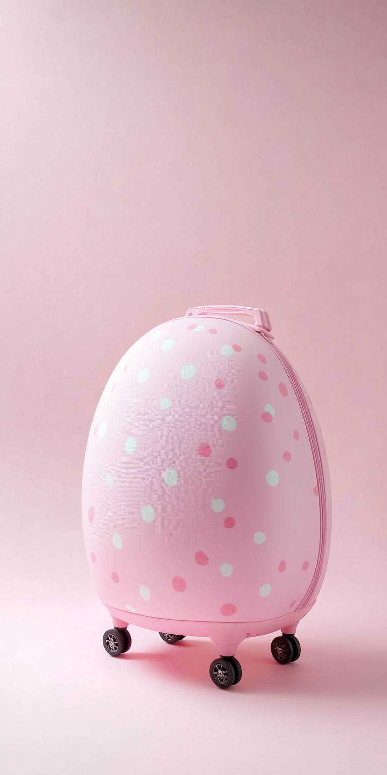 photo of a pink bag egg shape. the suitcase is egg shape has pastel polca dots, has wheels. the photo is from the studio. studio light. the background is pastel light pink. --ar 1:2 --style raw --v 6.1