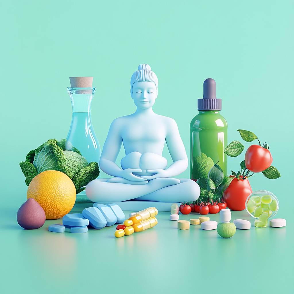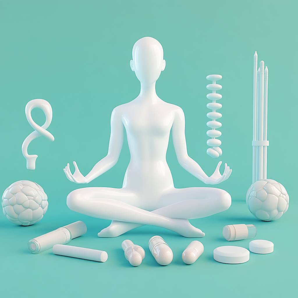 健康与养生:锻炼、饮食、睡眠、传统中医、瑜伽、保健品、体检、免疫、心理健康、康复训练,纯色背景,3D,卡通风格,高分辨率,无变形的手指和脚