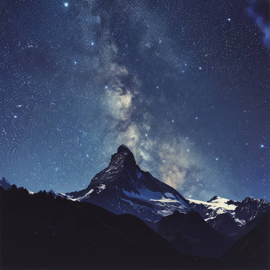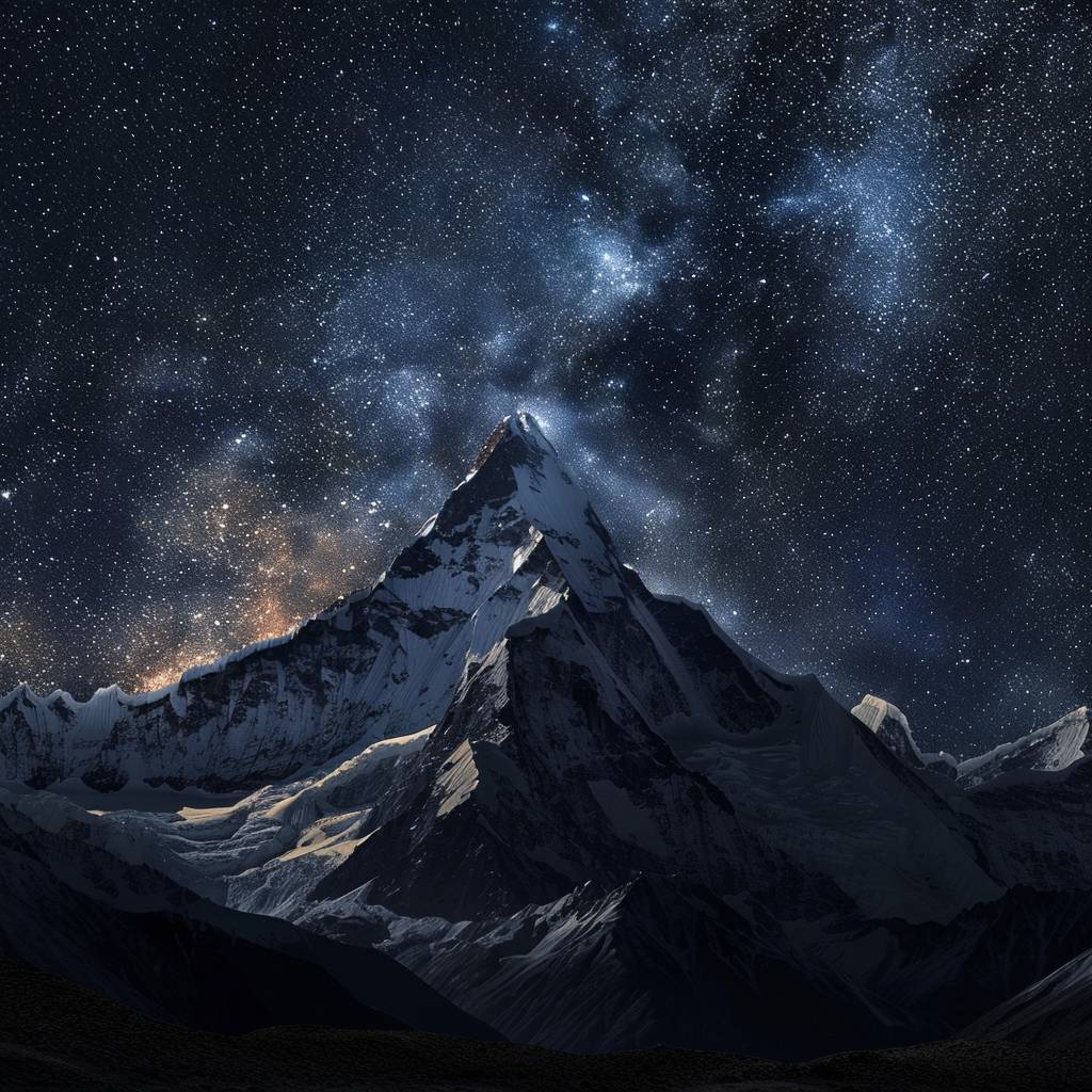 在星空下的雄伟山脉,展现出宁静而令人敬畏的场景,描绘出大地的坚固与宇宙的浩瀚之间的对比。