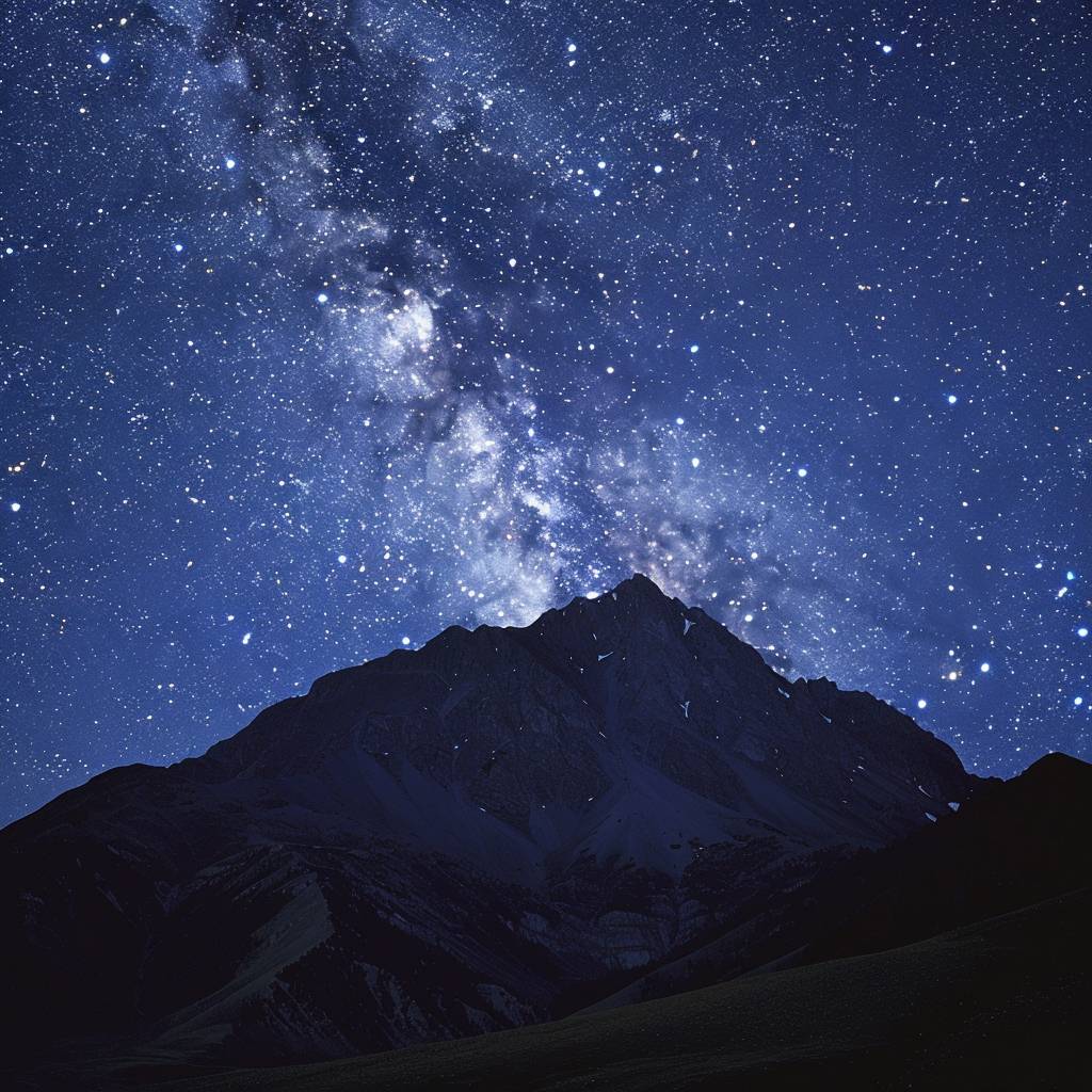 一座宏伟的山脉在星空璀璨的夜空下,创造出宁静而令人敬畏的场景。山脉尖锐、崎岖的边缘在浓密的星辰幕布下形成剪影,展现出大地的持久坚固与宇宙的广袤之间的对比。场景中没有可见的文字,增强了其自然纯净,可能引发观者的思考。