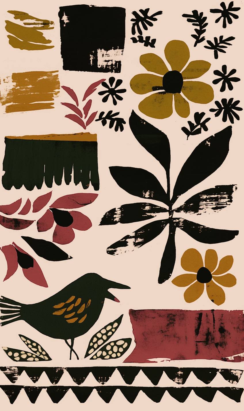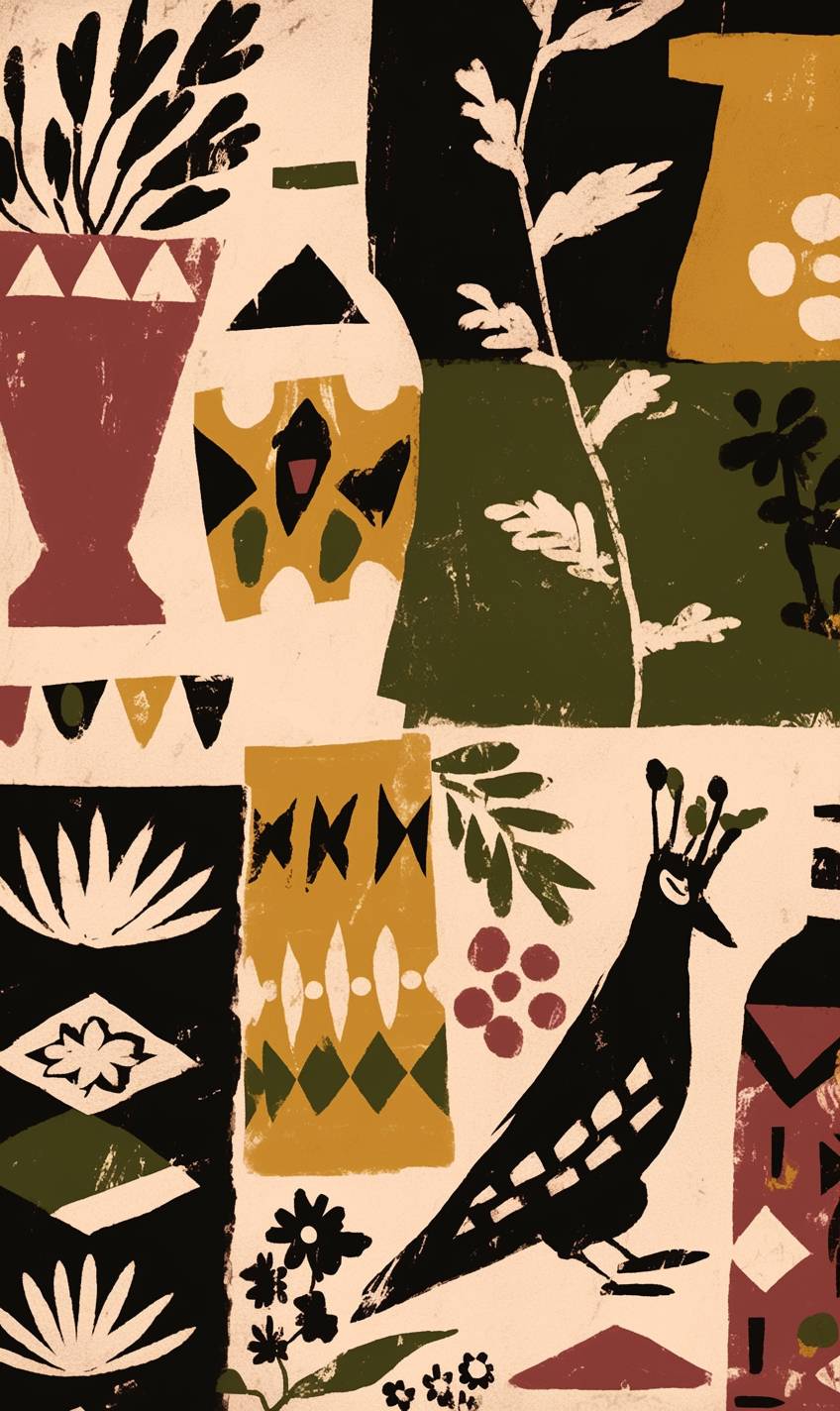 传统民间艺术表现,特色化的鸟、花卉和几何图案。