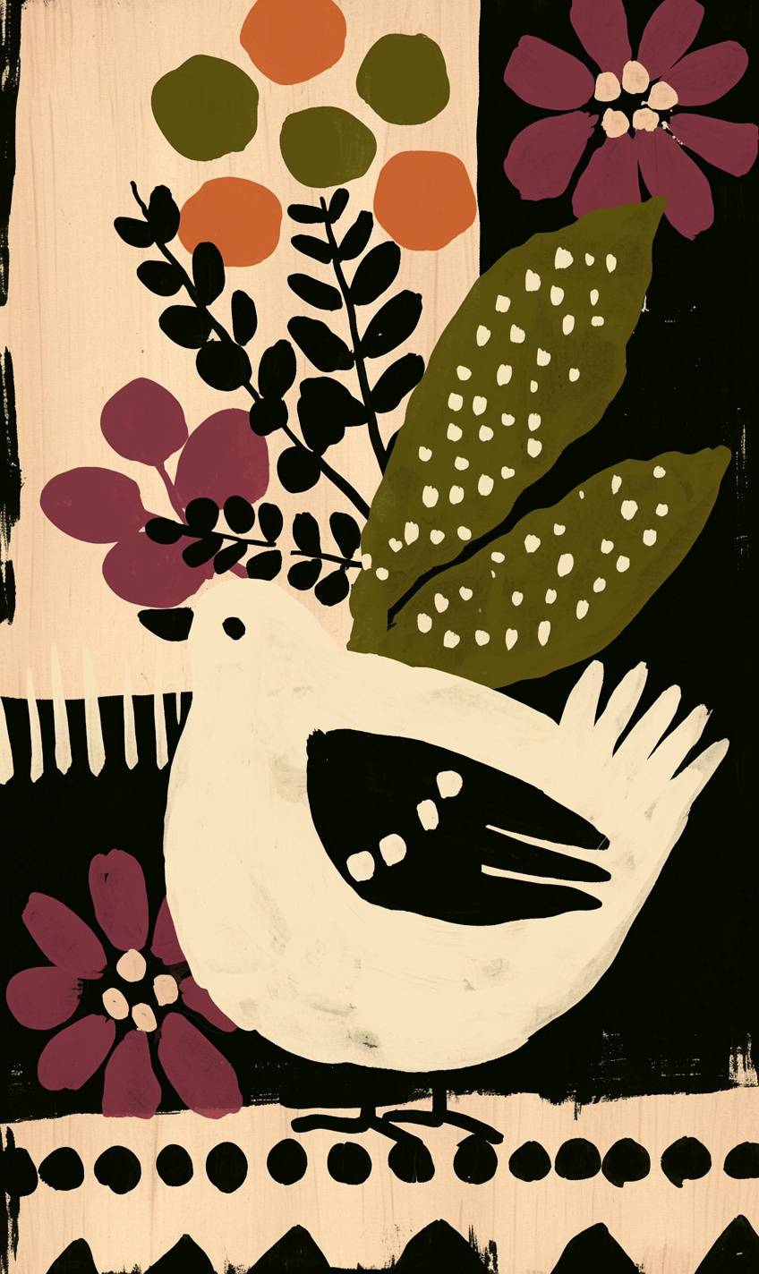 Traditional folk art representation featuring stylized bird, flowers, and geometric patterns --sref 2198780510 --ar 3:5 --niji 6 --style raw