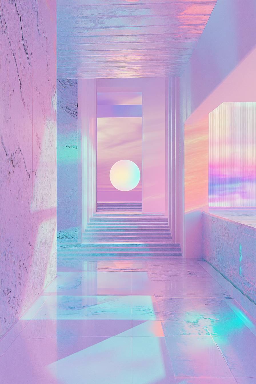 在色彩梦境中,一个有飘浮几何体和彩虹色网络光环的虚幻蒸汽波场景。柔和的色调和颜色调色板增强了故障失真,模糊了存在和记忆。